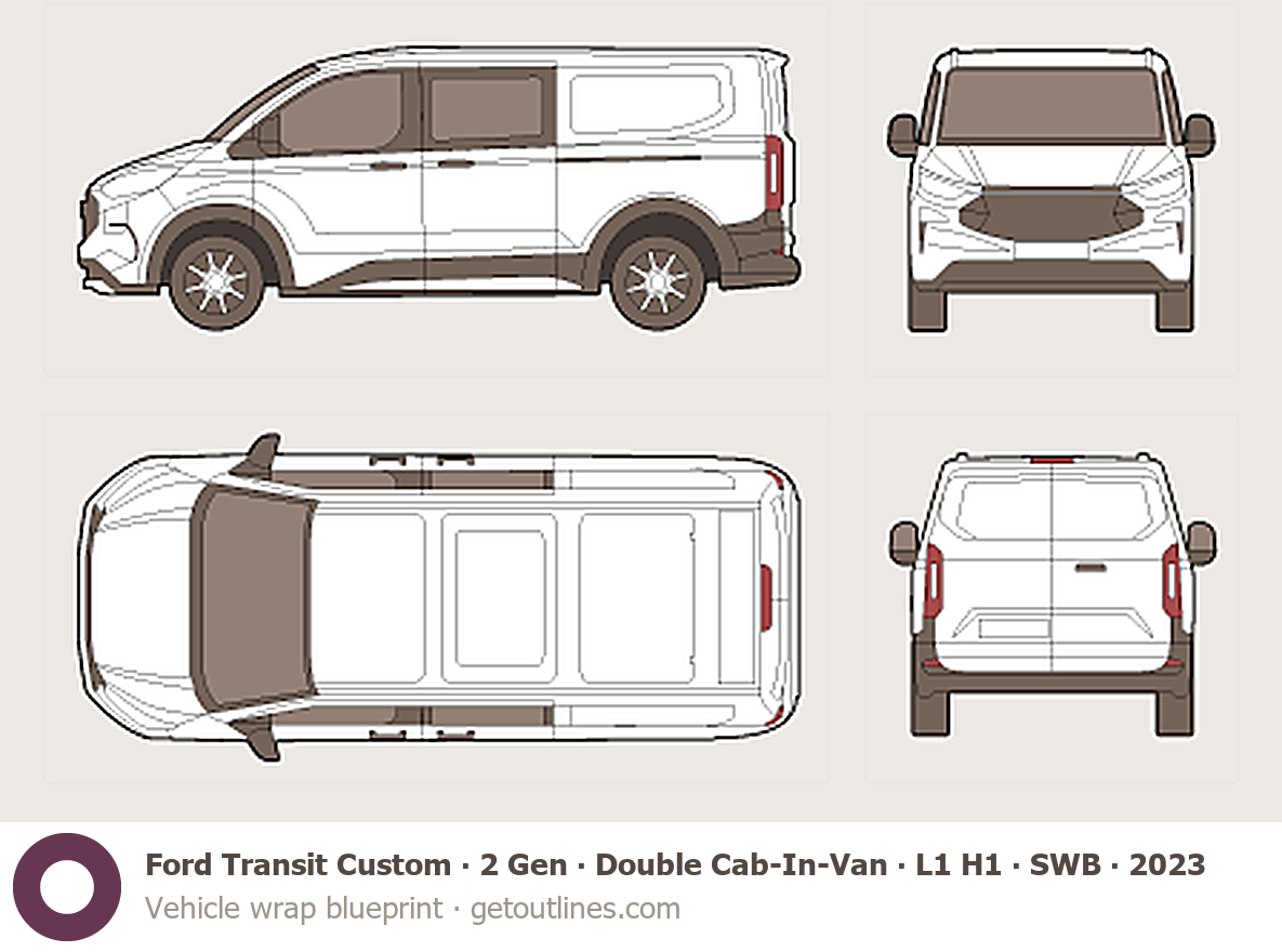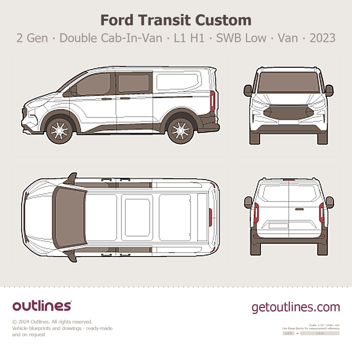 Buy this Ford Transit Custom 2 Gen blueprint and line drawing in high-quality editable vector file formats. Best for 3D and car wrap design.