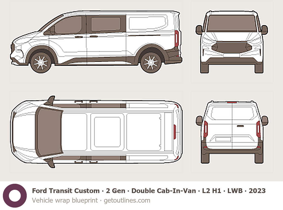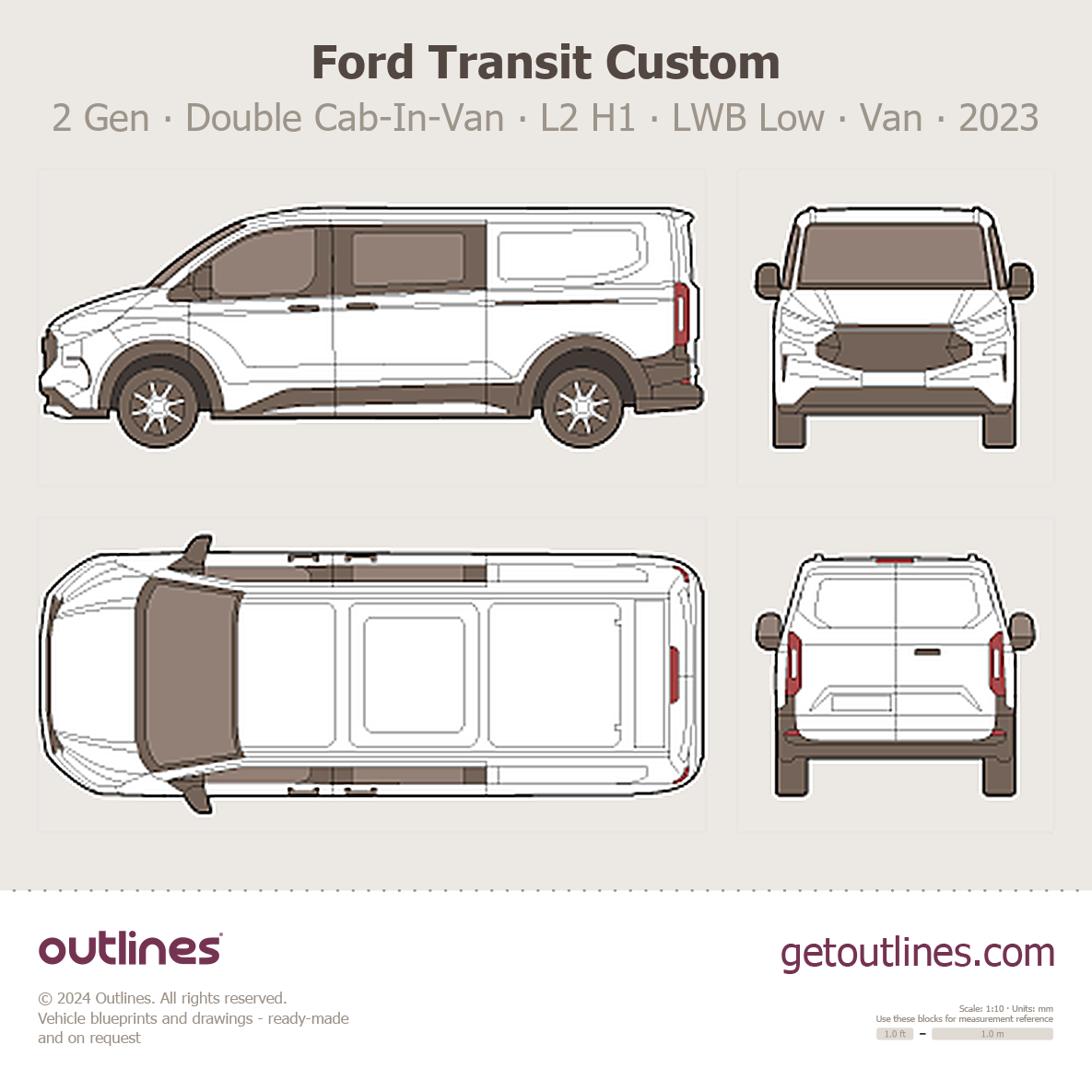 Buy this Ford Transit Custom 2 Gen blueprint and line drawing in high-quality editable vector file formats. Best for 3D and car wrap design.