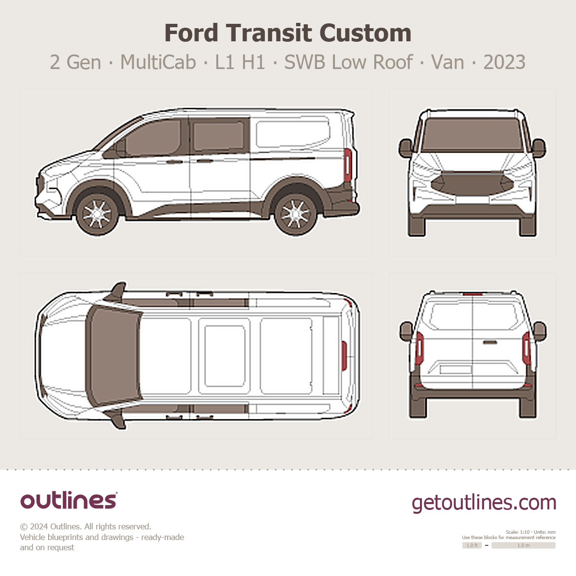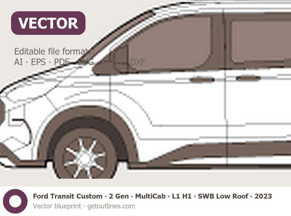 Buy this Ford Transit Custom 2 Gen blueprint and line drawing in high-quality editable vector file formats. Best for 3D and car wrap design.