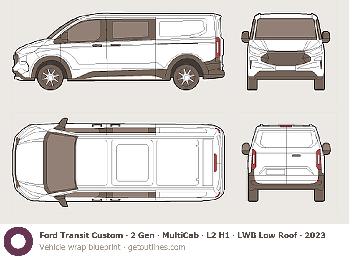 This 2023 Ford Transit Custom 2 Gen MultiCab ∙ L2 H1 ∙ LWB Low Roof Van blueprint helps designers, wrap studios, and 3D artists simplify their workflow and save valuable time for creative work instead of routine tasks.