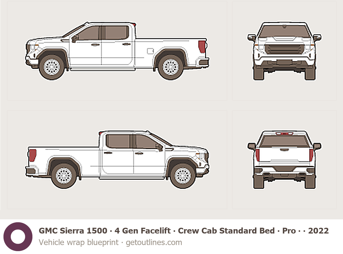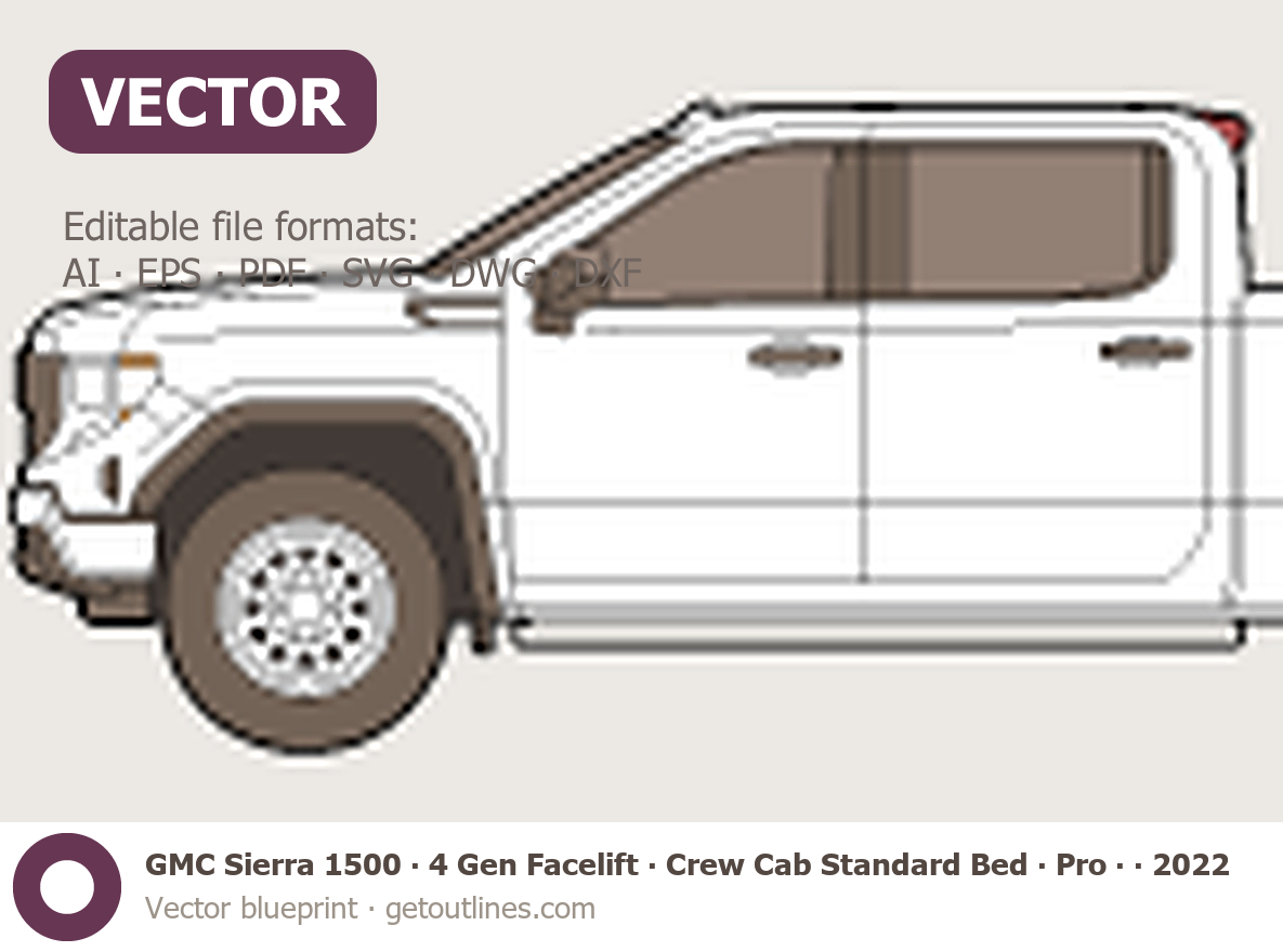 Buy this GMC Sierra 1500 4 Gen Facelift blueprint and line drawing in high-quality editable vector file formats. Best for 3D and car wrap design.