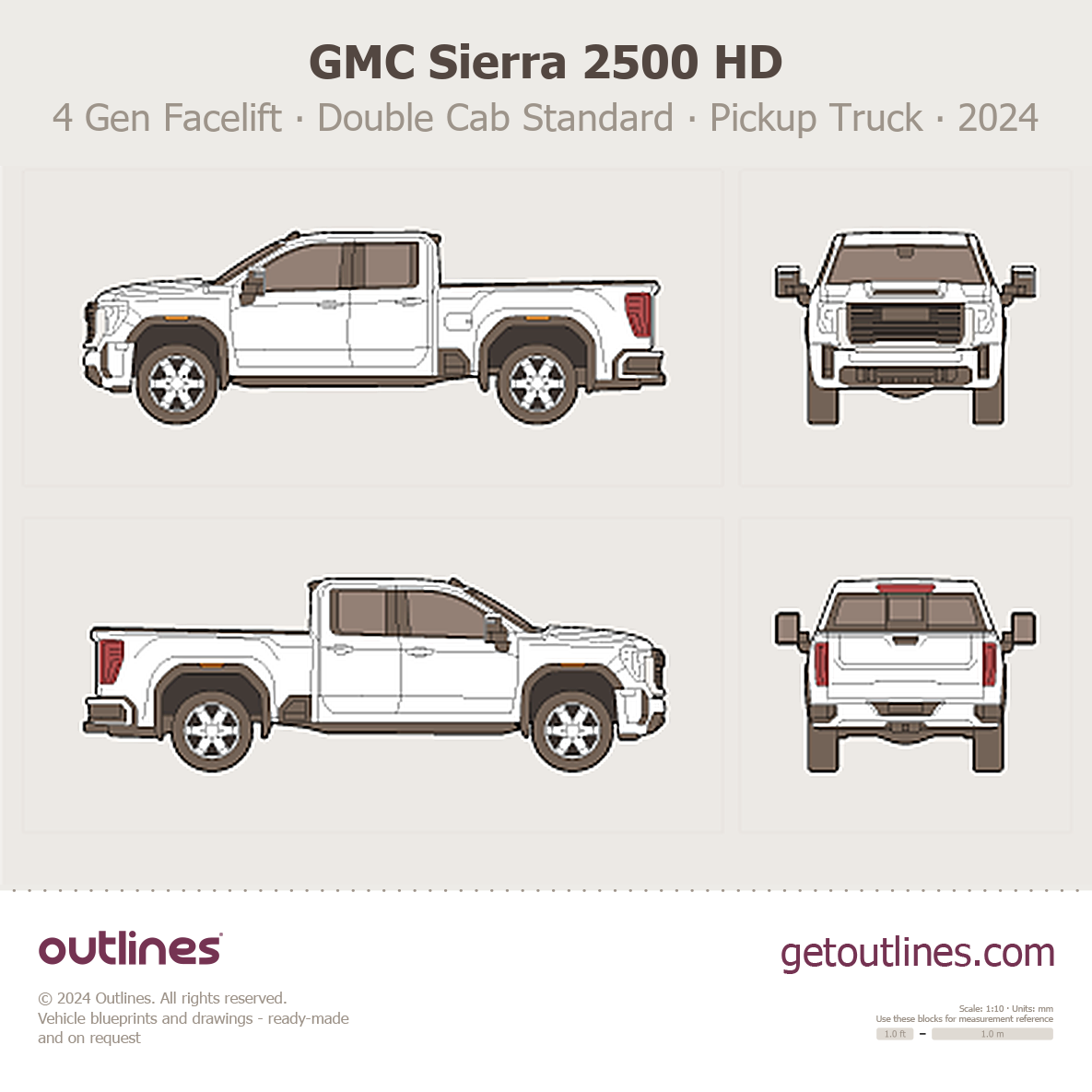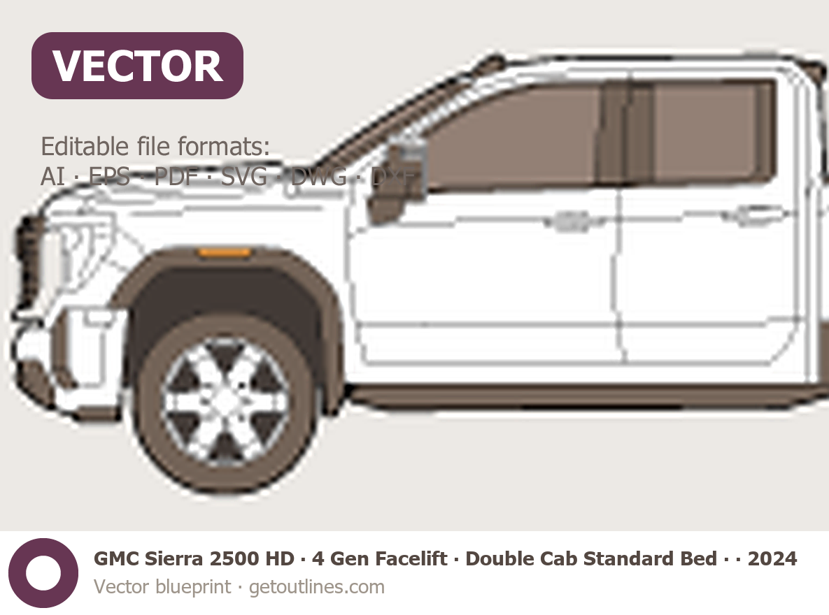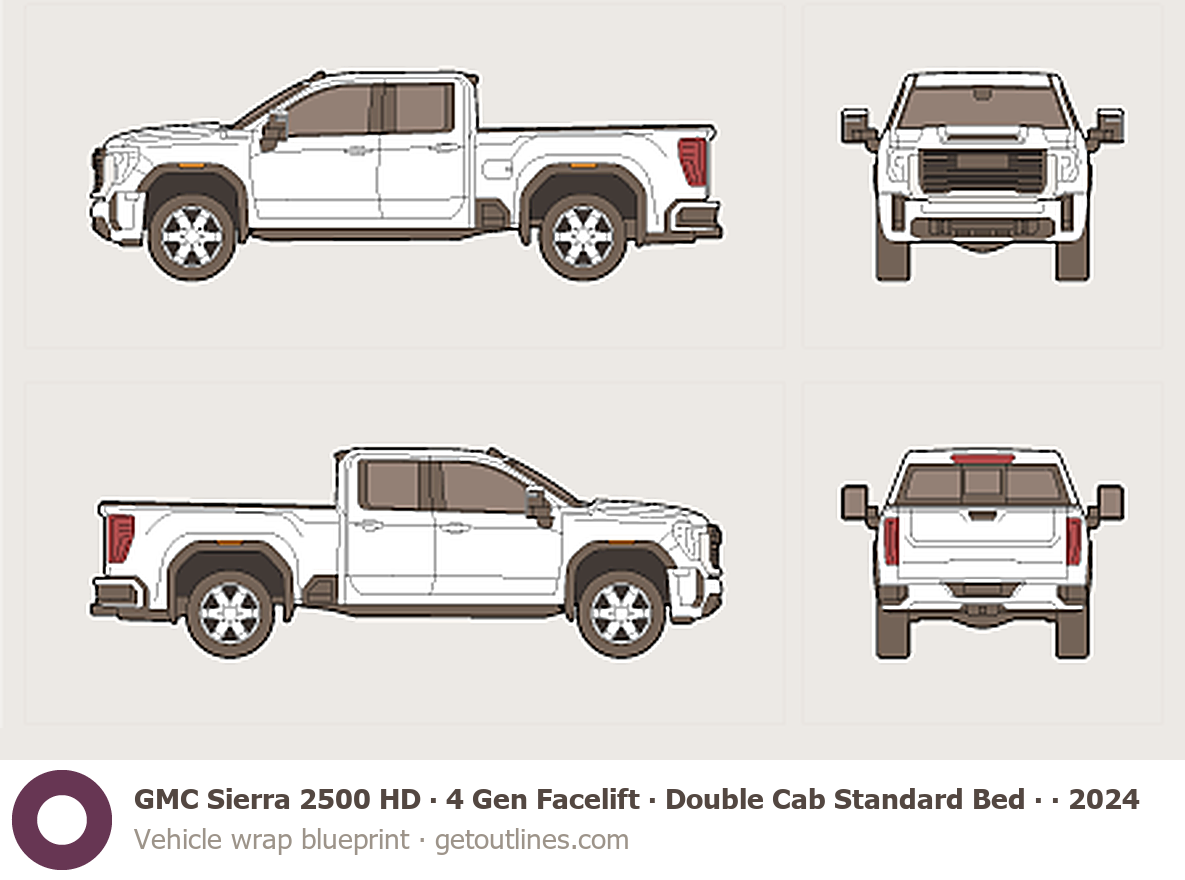 Buy this GMC Sierra 2500 HD 4 Gen Facelift blueprint and line drawing in high-quality editable vector file formats. Best for 3D and car wrap design.