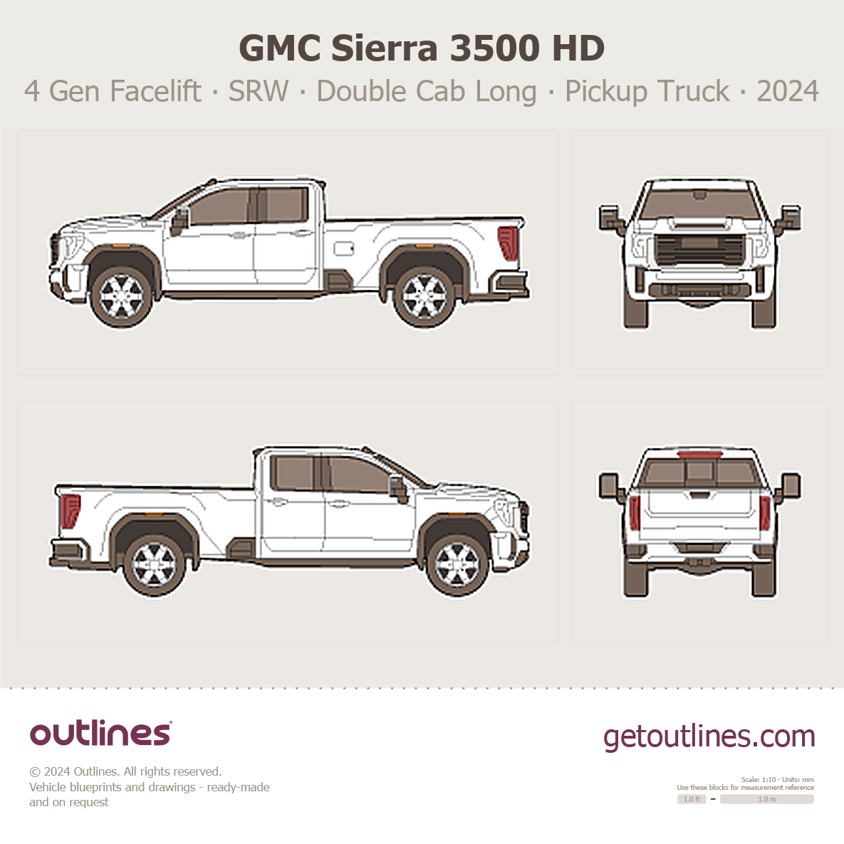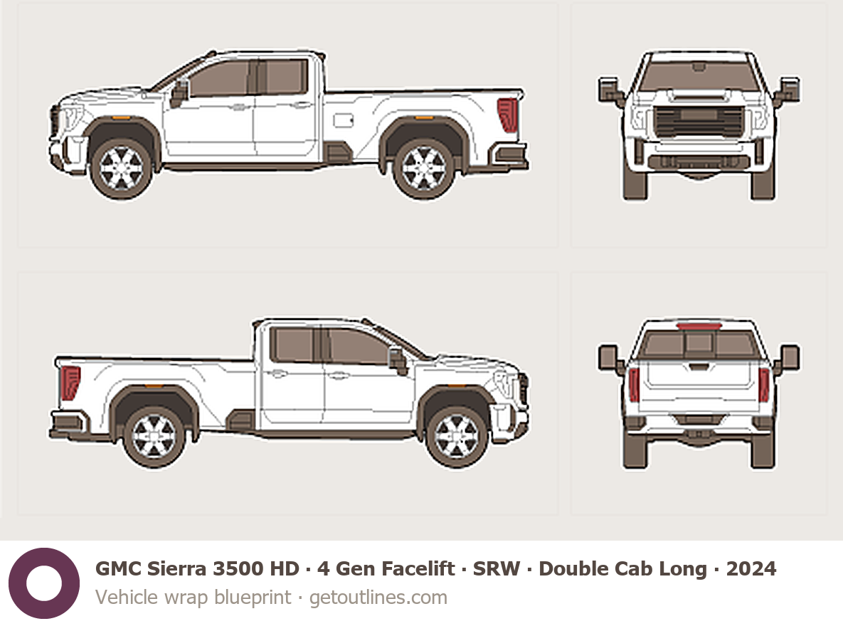 Buy this GMC Sierra 3500 HD 4 Gen Facelift blueprint and line drawing in high-quality editable vector file formats. Best for 3D and car wrap design.