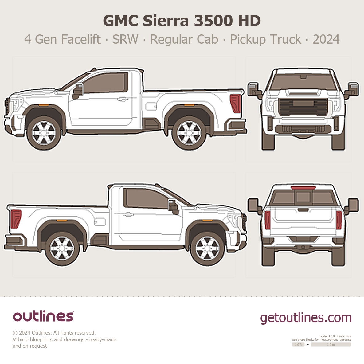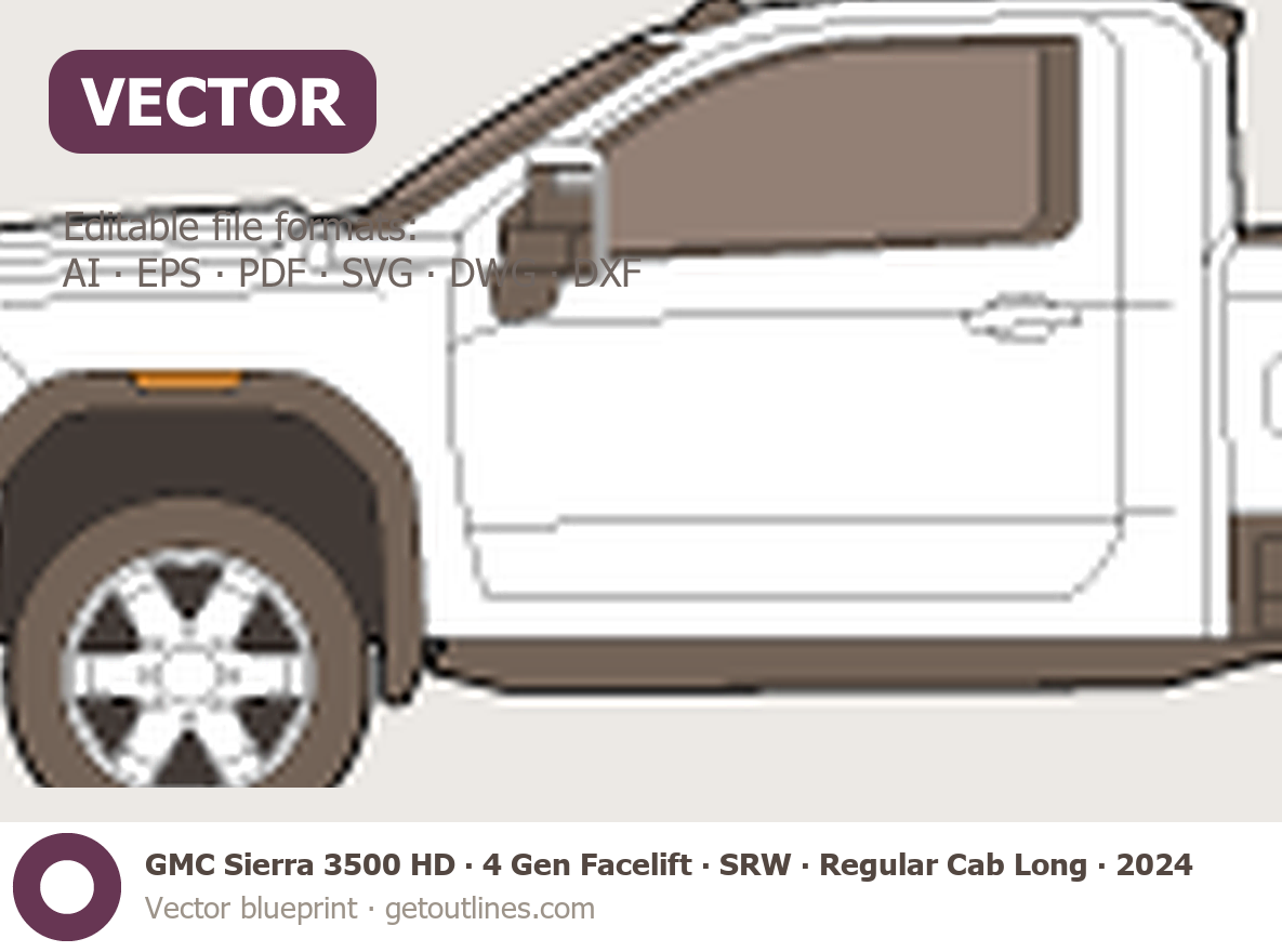 Buy this GMC Sierra 3500 HD 4 Gen Facelift blueprint and line drawing in high-quality editable vector file formats. Best for 3D and car wrap design.