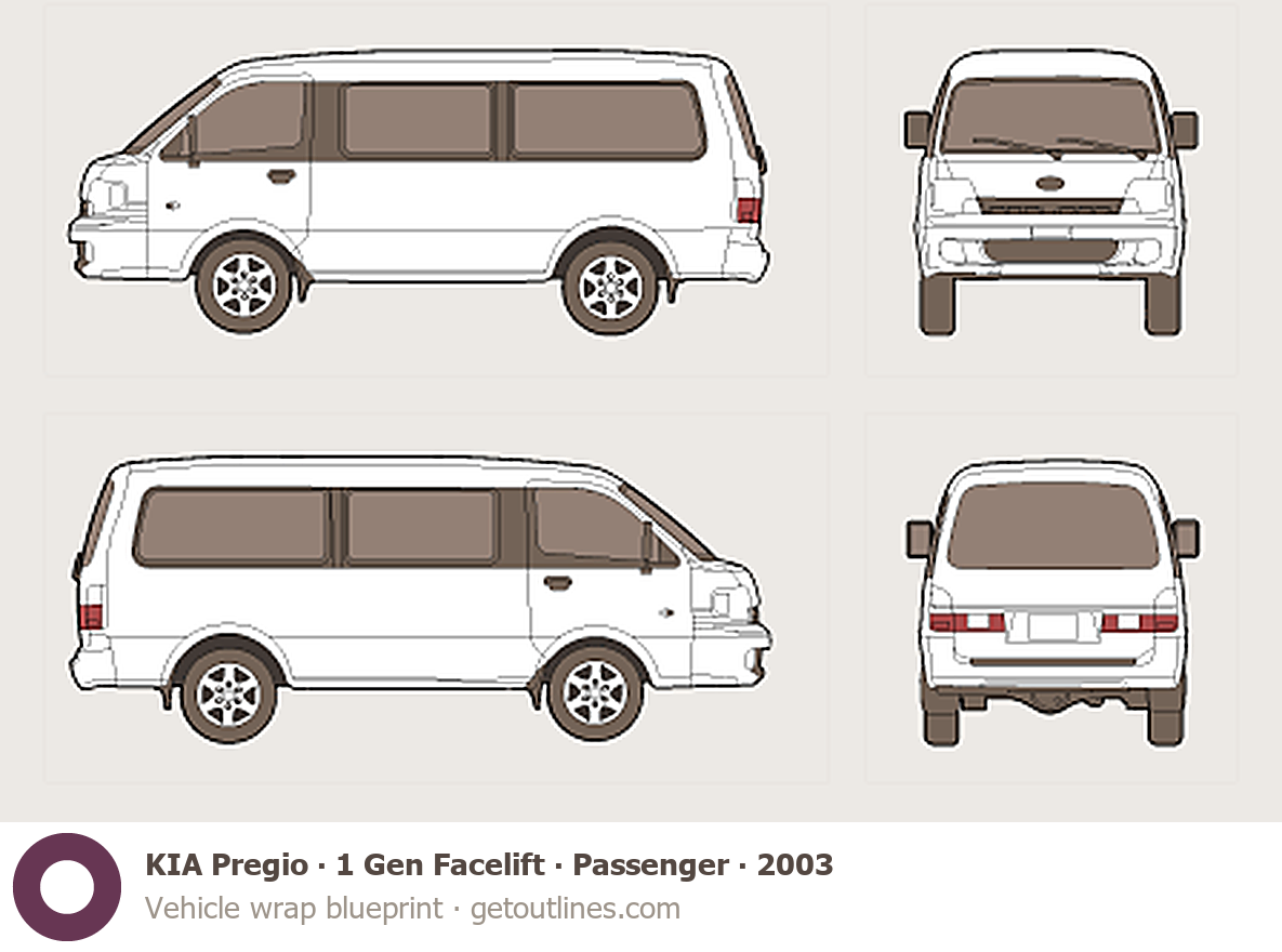 This 2003 KIA Pregio 1 Gen Facelift Passenger Wagon blueprint helps designers, wrap studios, and 3D artists simplify their workflow and save valuable time for creative work instead of routine tasks.