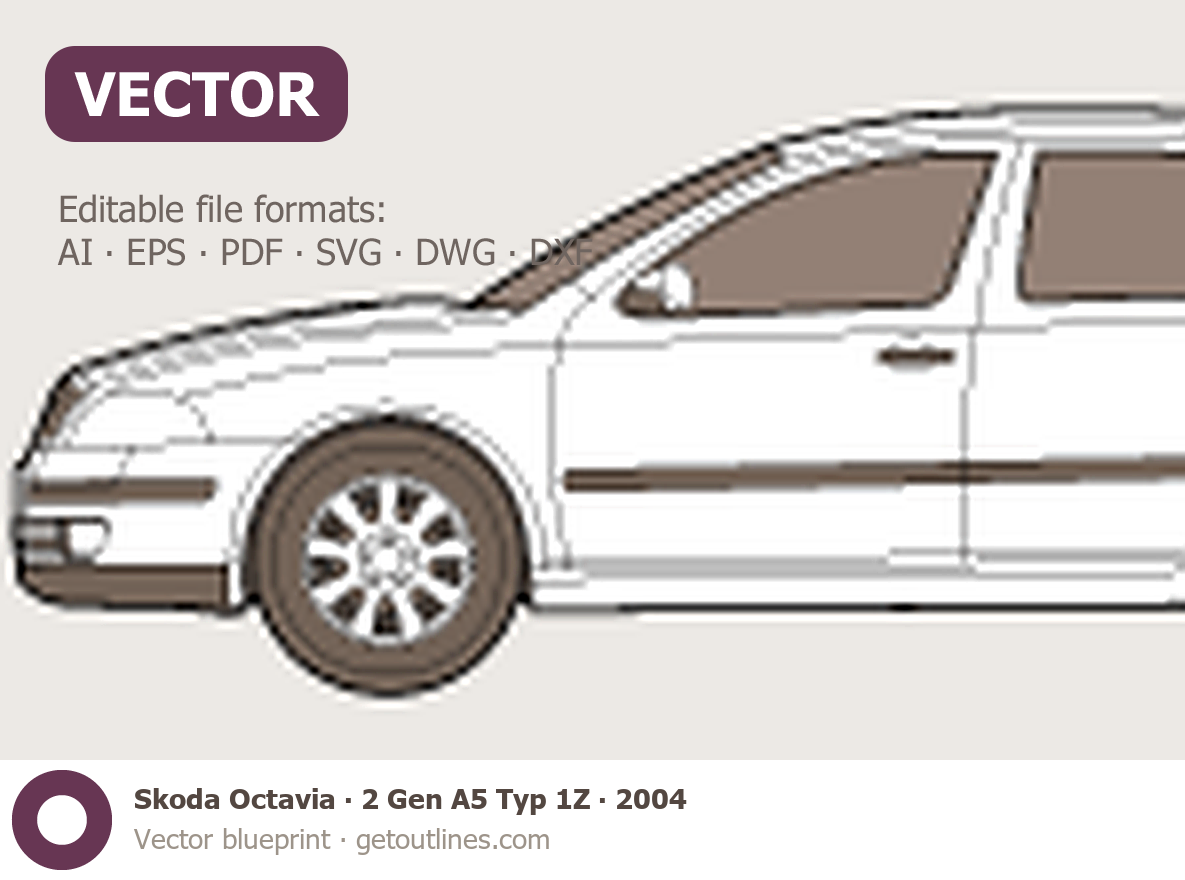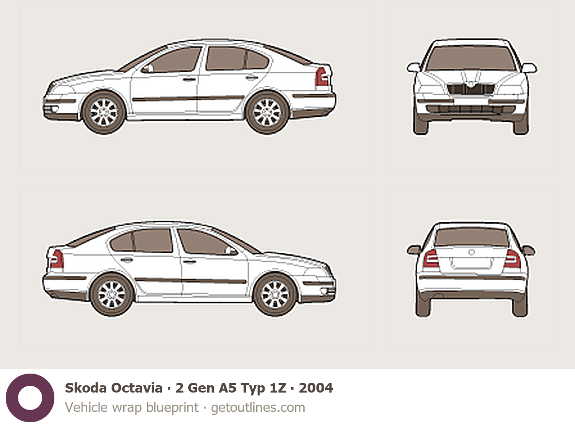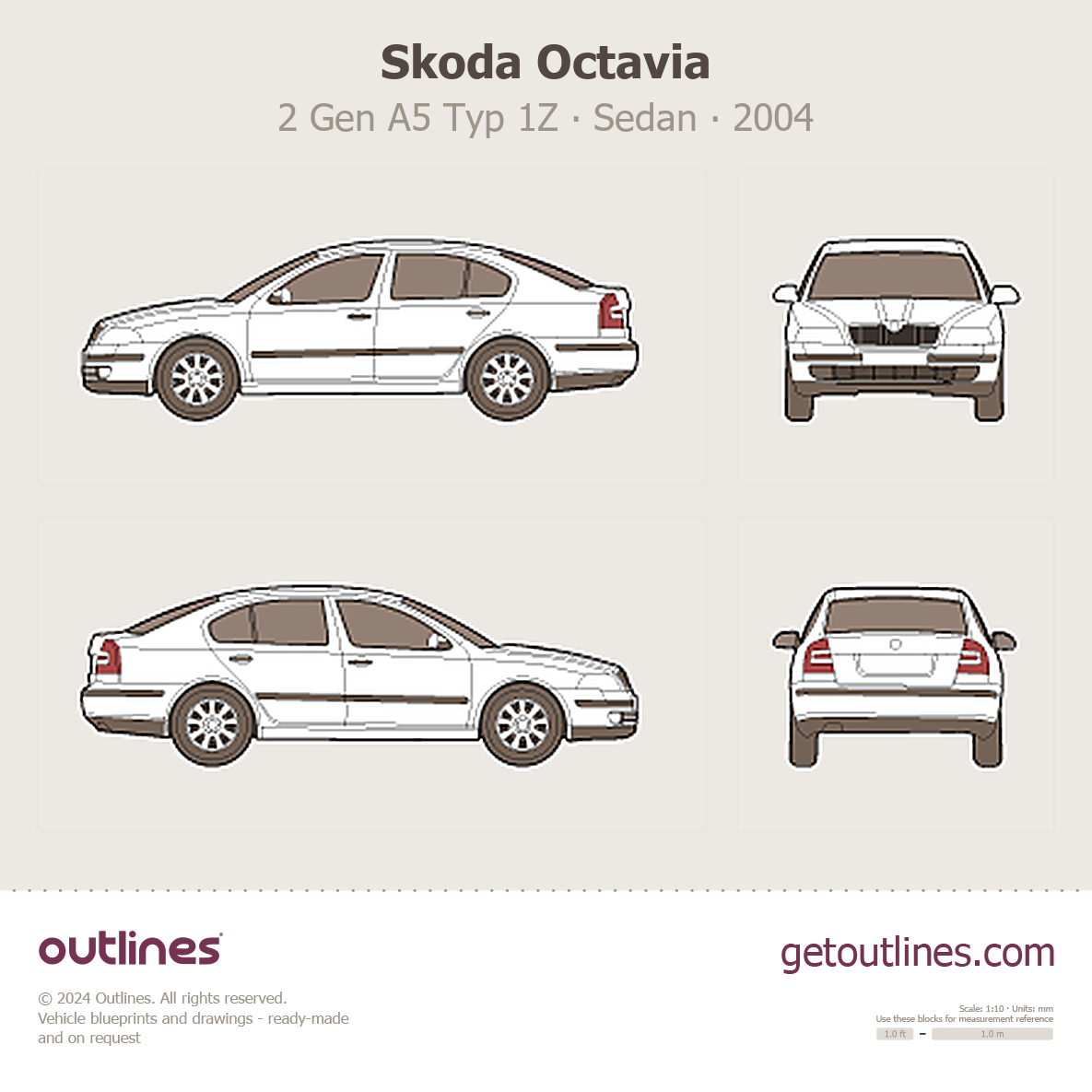 Buy this Skoda Octavia 2 Gen A5 Typ 1Z blueprint and line drawing in high-quality editable vector file formats. Best for 3D and car wrap design.
