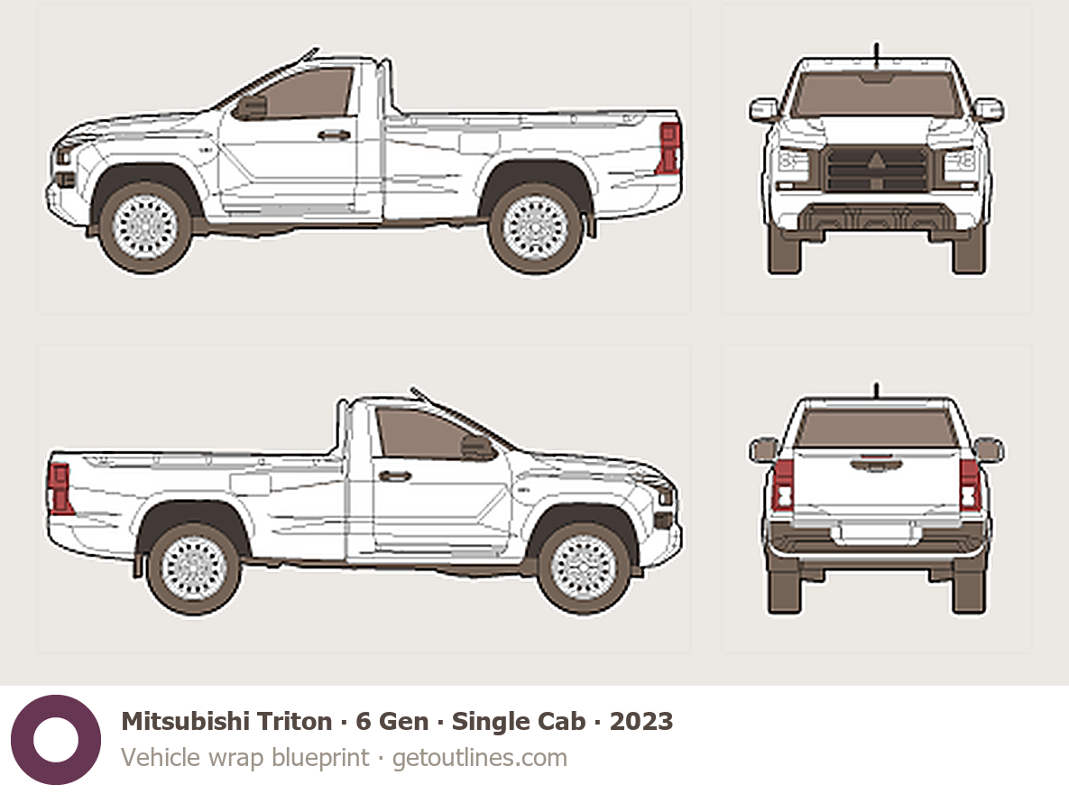 This 2023 Mitsubishi Triton 6 Gen Single Cab Pickup Truck blueprint helps designers, wrap studios, and 3D artists simplify their workflow and save valuable time for creative work instead of routine tasks.