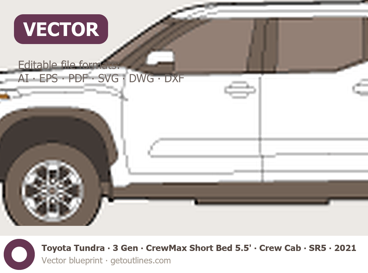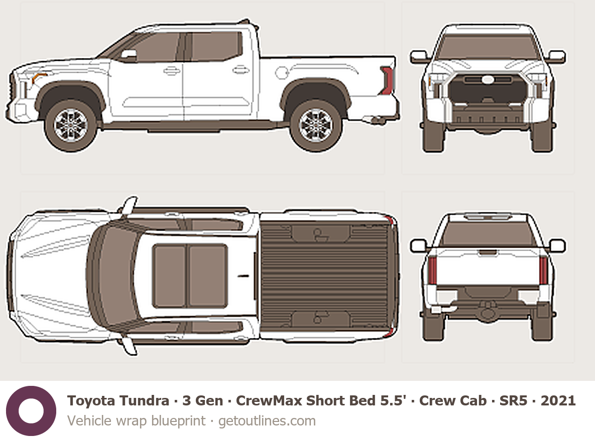 This 2021 Toyota Tundra 3 Gen CrewMax Short Bed 5.5' ∙ Crew Cab ∙ SR5 Pickup Truck blueprint helps designers, wrap studios, and 3D artists simplify their workflow and save valuable time for creative work instead of routine tasks.