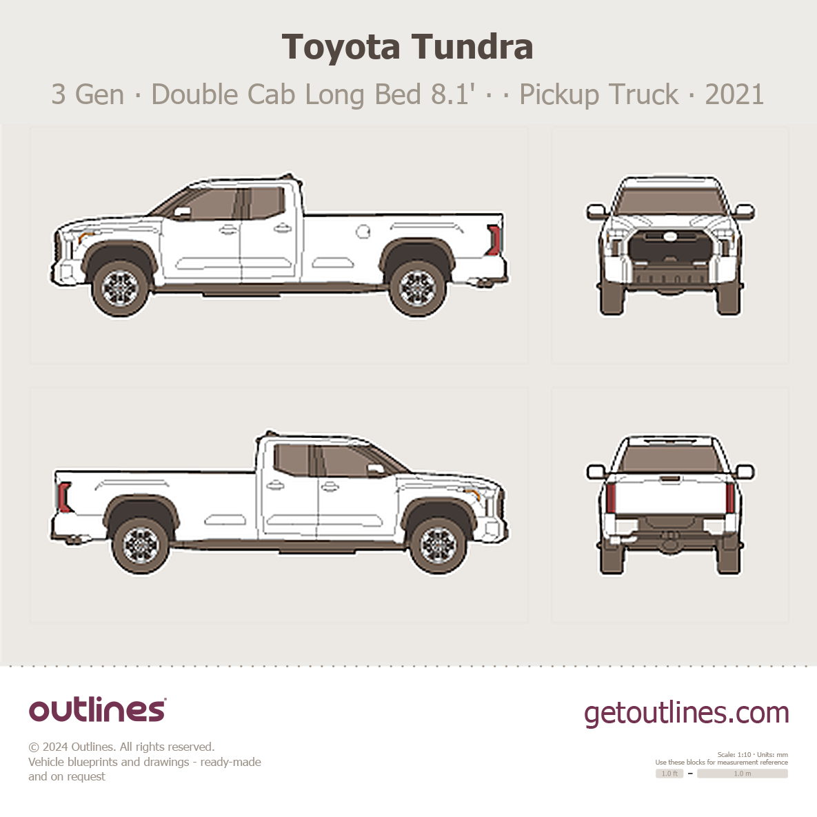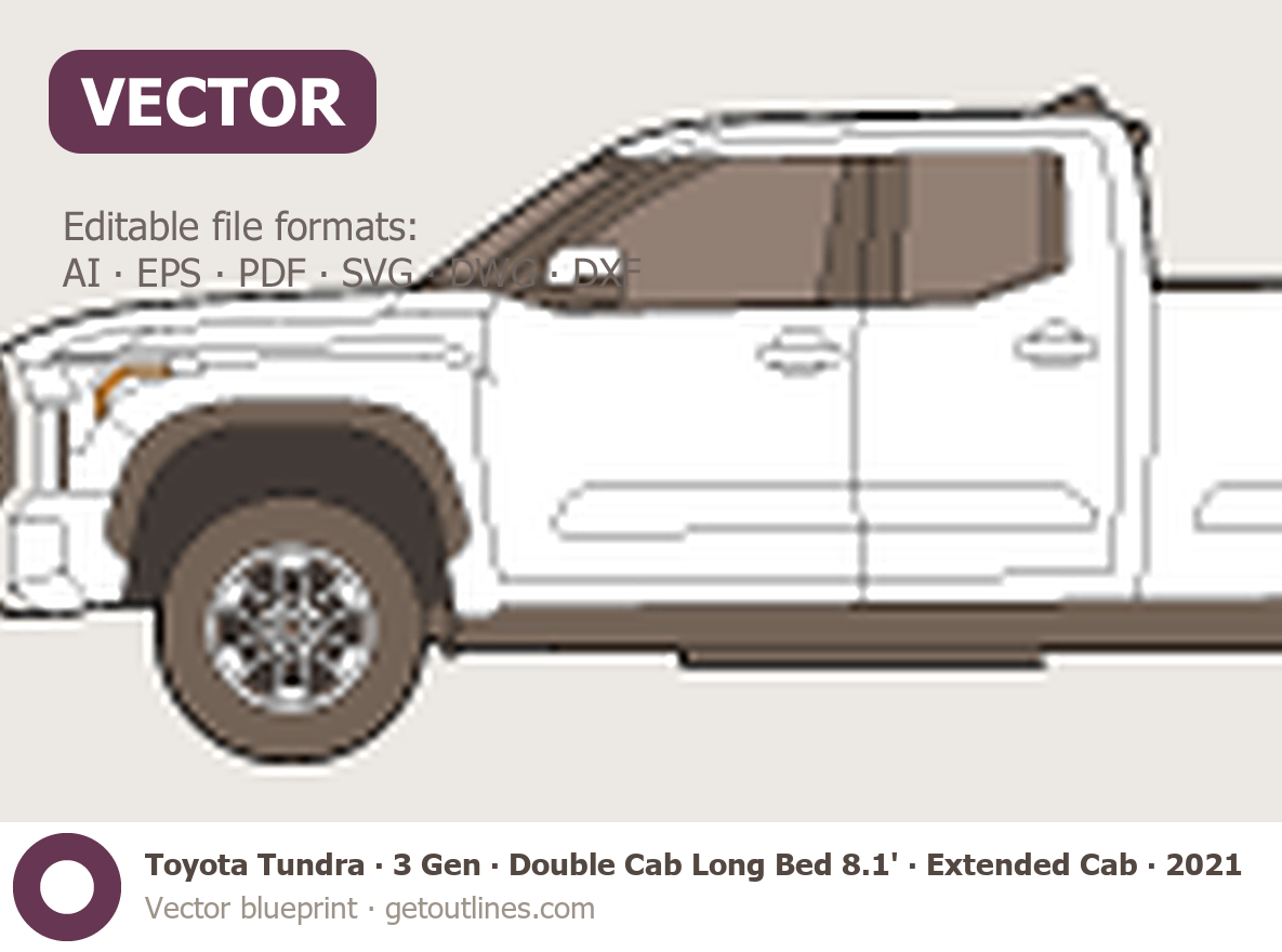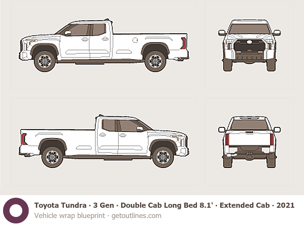 This 2021 Toyota Tundra 3 Gen Double Cab Long Bed 8.1' ∙ Extended Cab ∙ SR5 Pickup Truck blueprint helps designers, wrap studios, and 3D artists simplify their workflow and save valuable time for creative work instead of routine tasks.