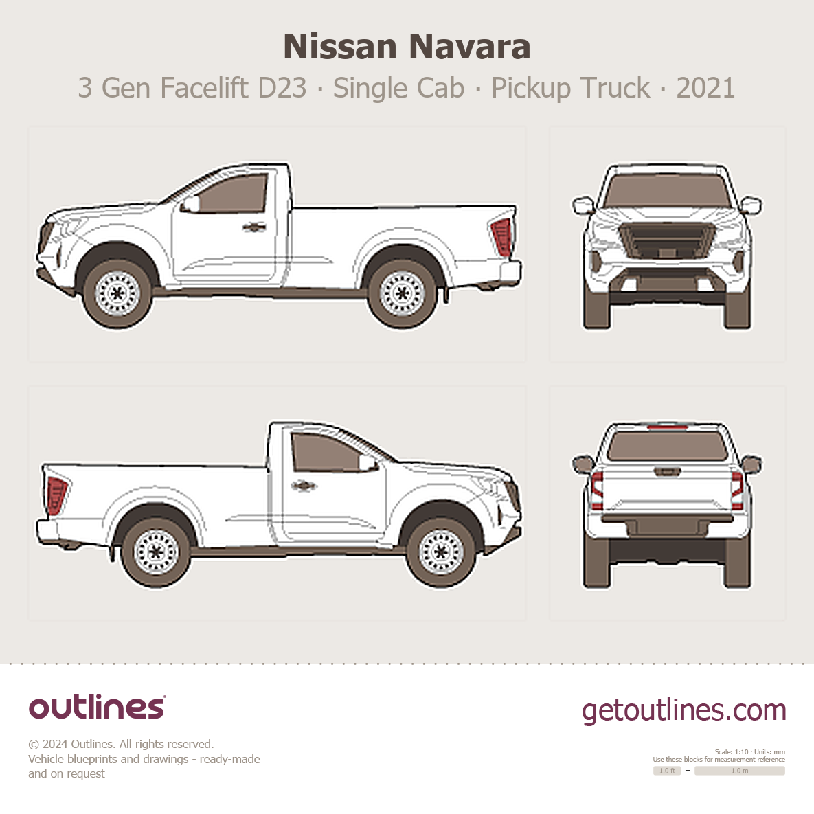 Buy this Nissan Navara 3 Gen Facelift D23 blueprint and line drawing in high-quality editable vector file formats. Best for 3D and car wrap design.