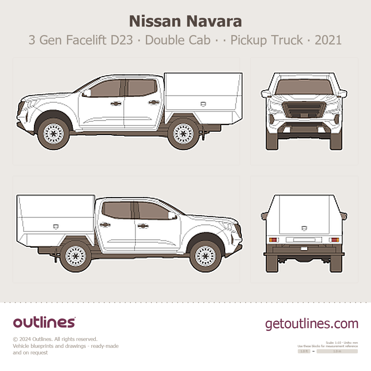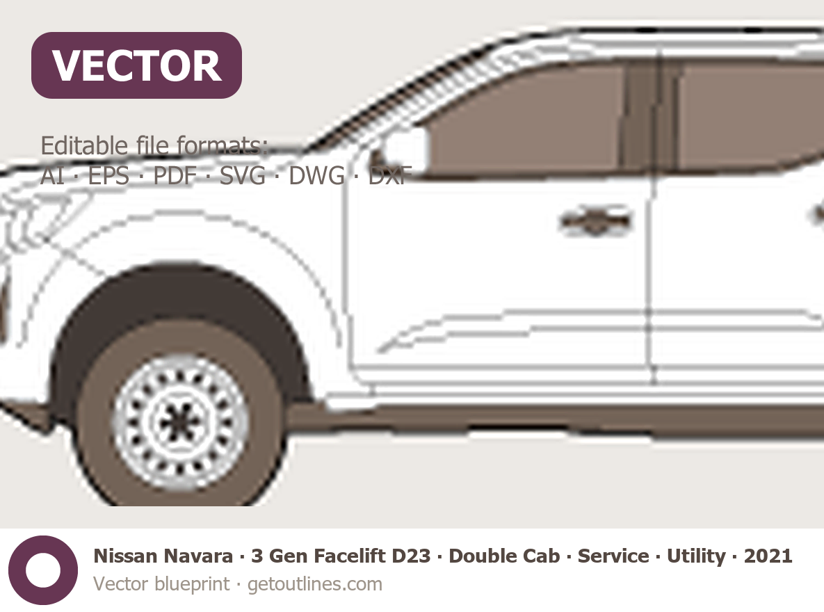 Buy this Nissan Navara 3 Gen Facelift D23 blueprint and line drawing in high-quality editable vector file formats. Best for 3D and car wrap design.