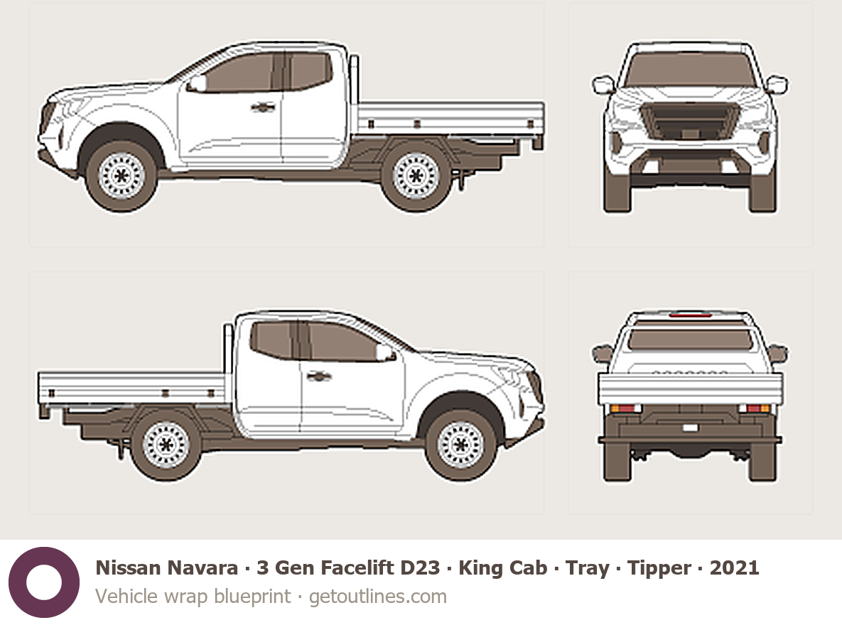 This 2021 Nissan Navara 3 Gen Facelift D23 King Cab ∙ Tray ∙ Tipper Pickup Truck blueprint helps designers, wrap studios, and 3D artists simplify their workflow and save valuable time for creative work instead of routine tasks.