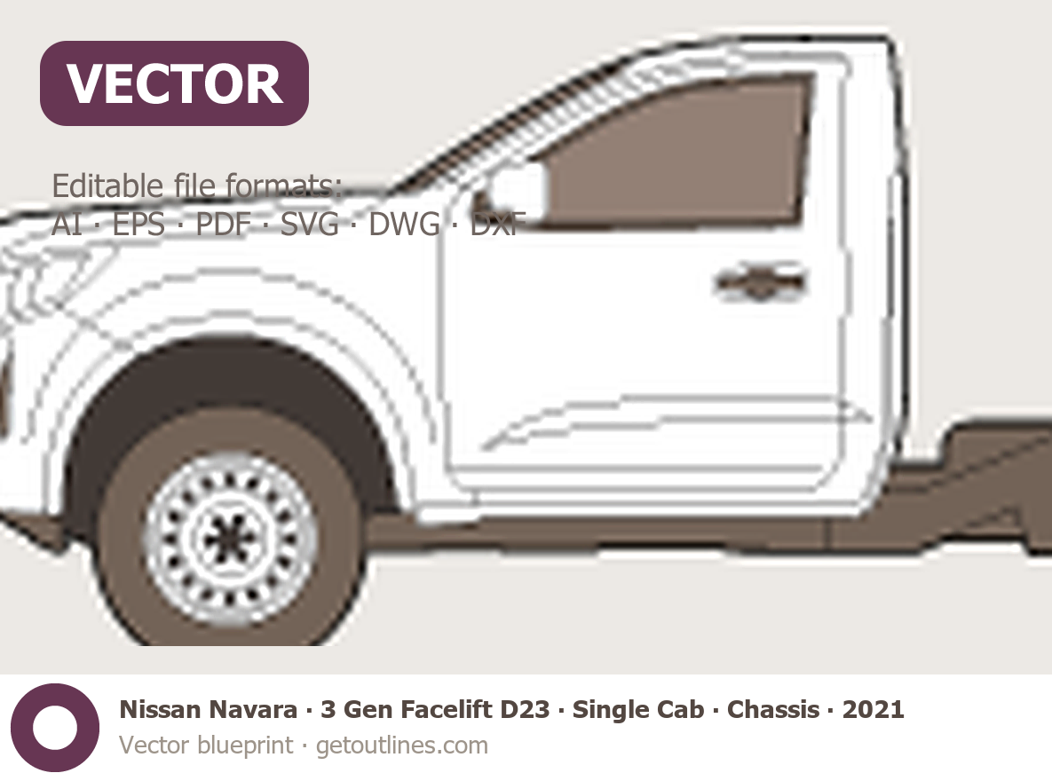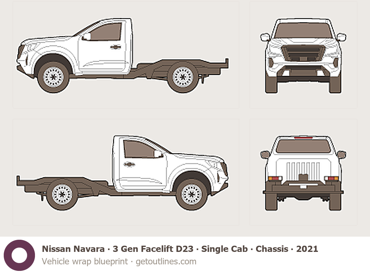This 2021 Nissan Navara 3 Gen Facelift D23 Single Cab ∙ Chassis Pickup Truck blueprint helps designers, wrap studios, and 3D artists simplify their workflow and save valuable time for creative work instead of routine tasks.