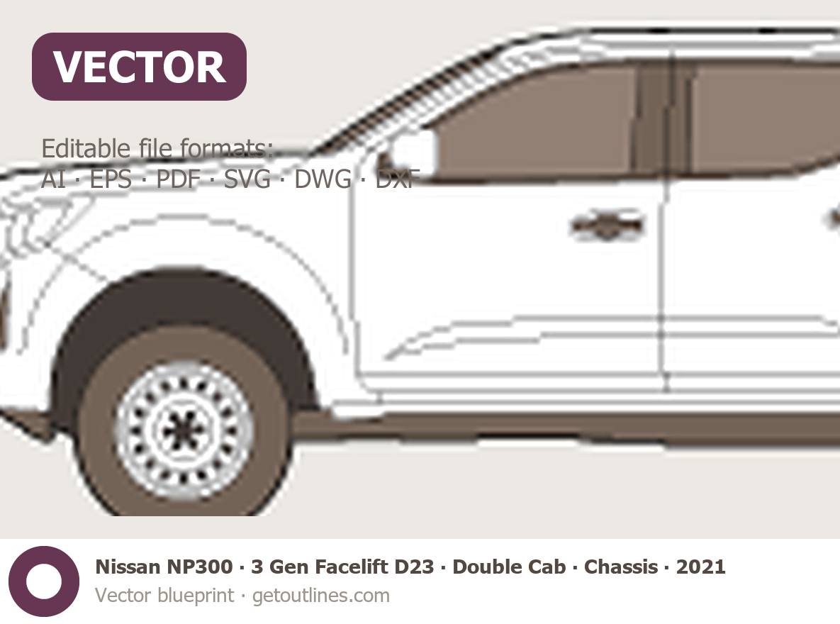 Buy this Nissan NP300 3 Gen Facelift D23 blueprint and line drawing in high-quality editable vector file formats. Best for 3D and car wrap design.