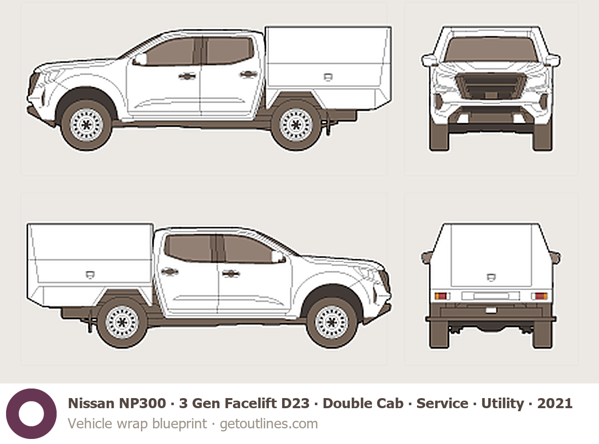 This 2021 Nissan NP300 3 Gen Facelift D23 Double Cab ∙ Service ∙ Utility Pickup Truck blueprint helps designers, wrap studios, and 3D artists simplify their workflow and save valuable time for creative work instead of routine tasks.