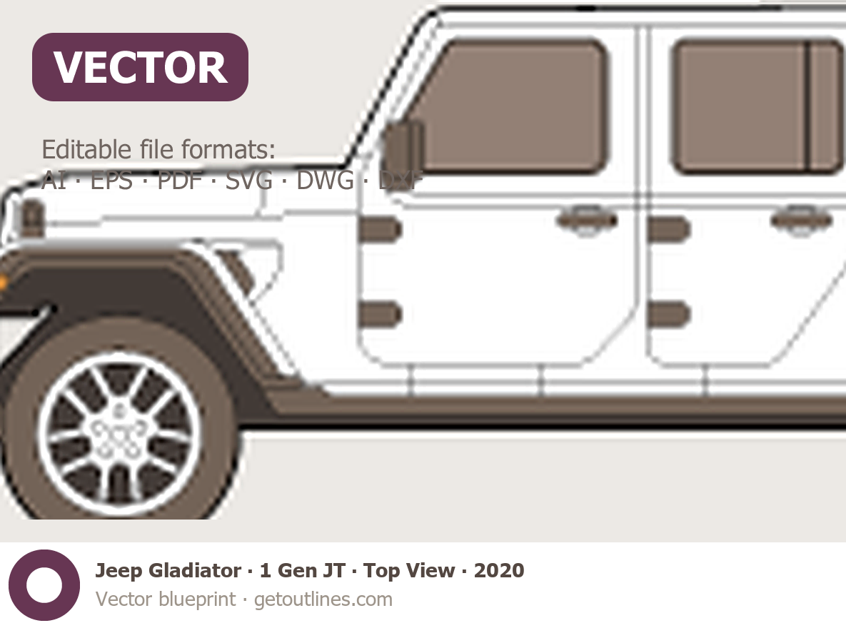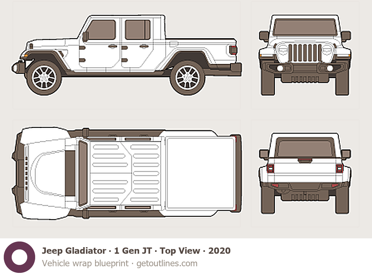 This 2020 Jeep Gladiator 1 Gen JT Top View Pickup Truck blueprint helps designers, wrap studios, and 3D artists simplify their workflow and save valuable time for creative work instead of routine tasks.