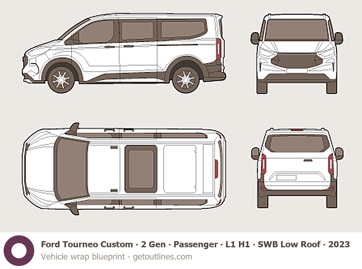 Buy this Ford Tourneo Custom 2 Gen blueprint and line drawing in high-quality editable vector file formats. Best for 3D and car wrap design.