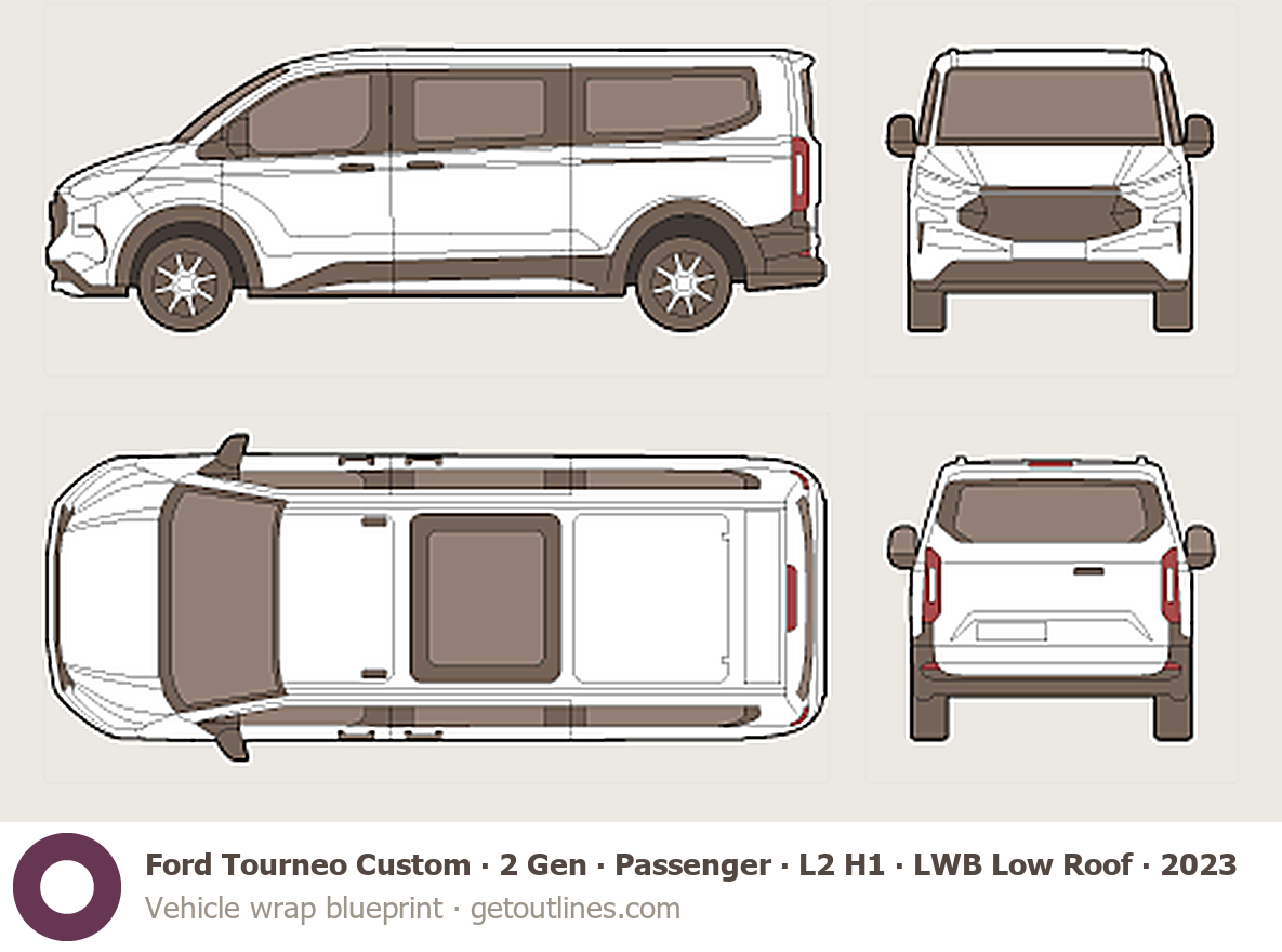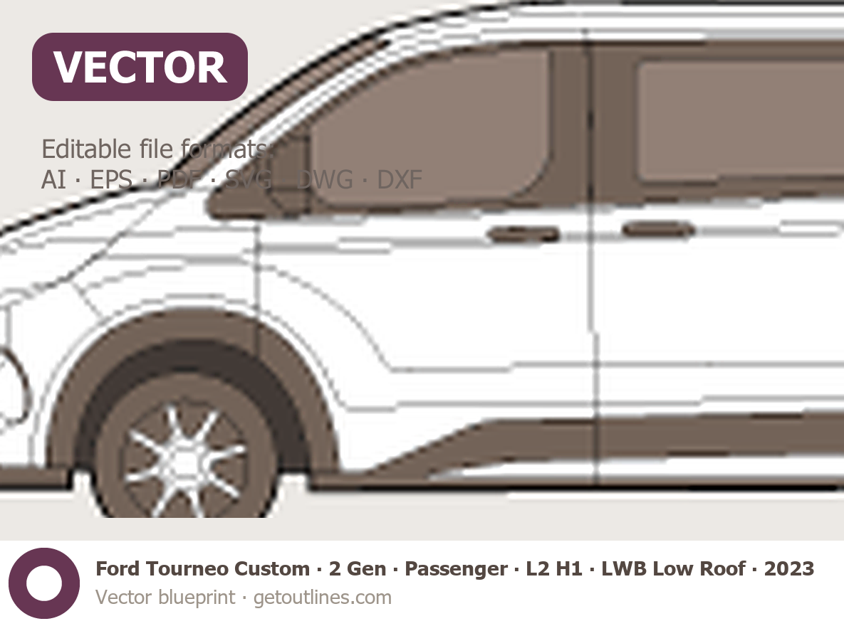 Buy this Ford Tourneo Custom 2 Gen blueprint and line drawing in high-quality editable vector file formats. Best for 3D and car wrap design.