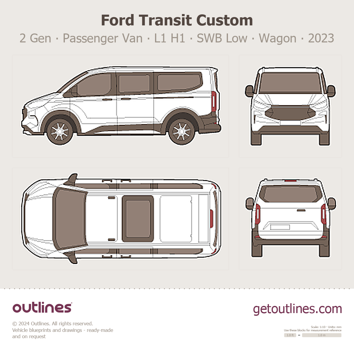 Buy this Ford Transit Custom 2 Gen blueprint and line drawing in high-quality editable vector file formats. Best for 3D and car wrap design.
