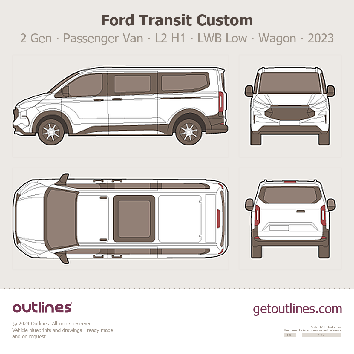 Buy this Ford Transit Custom 2 Gen blueprint and line drawing in high-quality editable vector file formats. Best for 3D and car wrap design.
