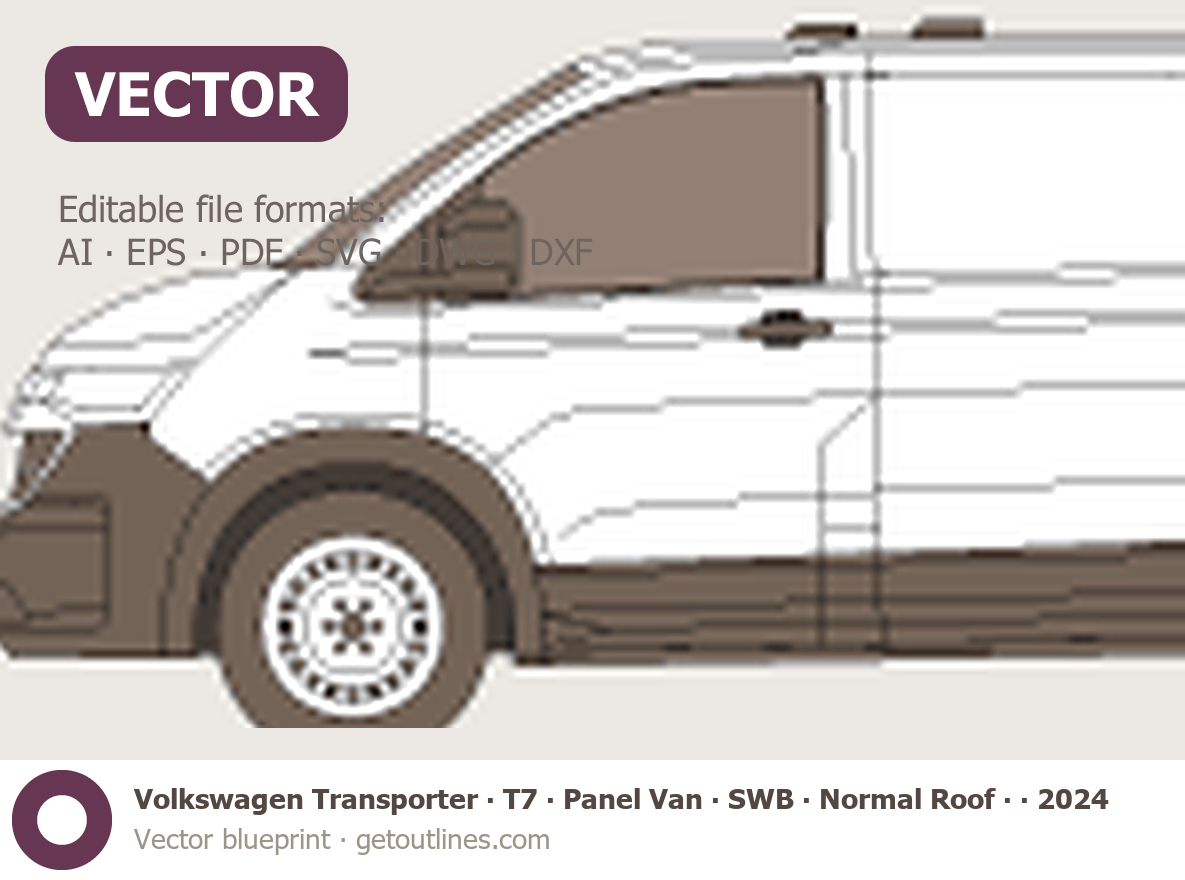 This 2024 Volkswagen Transporter T7 Panel Van ∙ SWB ∙ Normal Roof ∙ L1H1 Van blueprint helps designers, wrap studios, and 3D artists simplify their workflow and save valuable time for creative work instead of routine tasks.