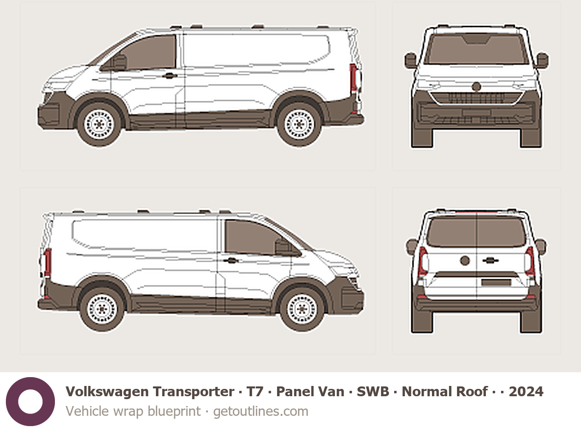 This template is suitable for Volkswagen Transporter models from 2024 to 2025, including 2024, and 2025 model years, and is commonly used for vehicle wrap and signage design.