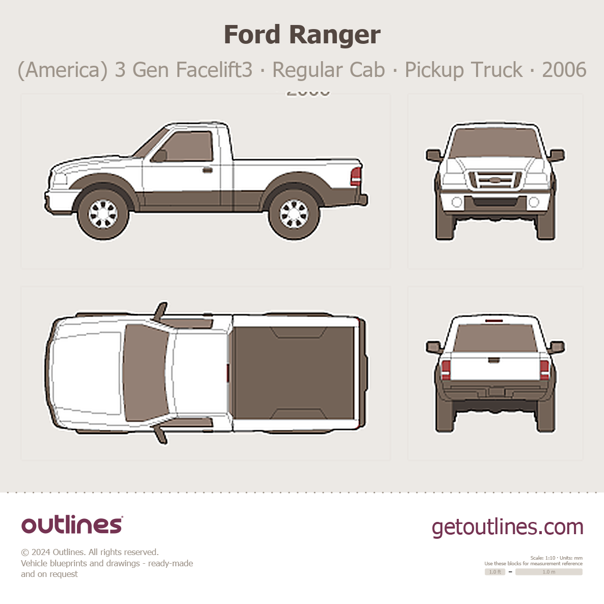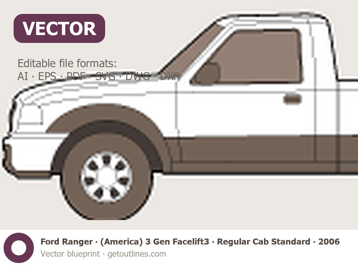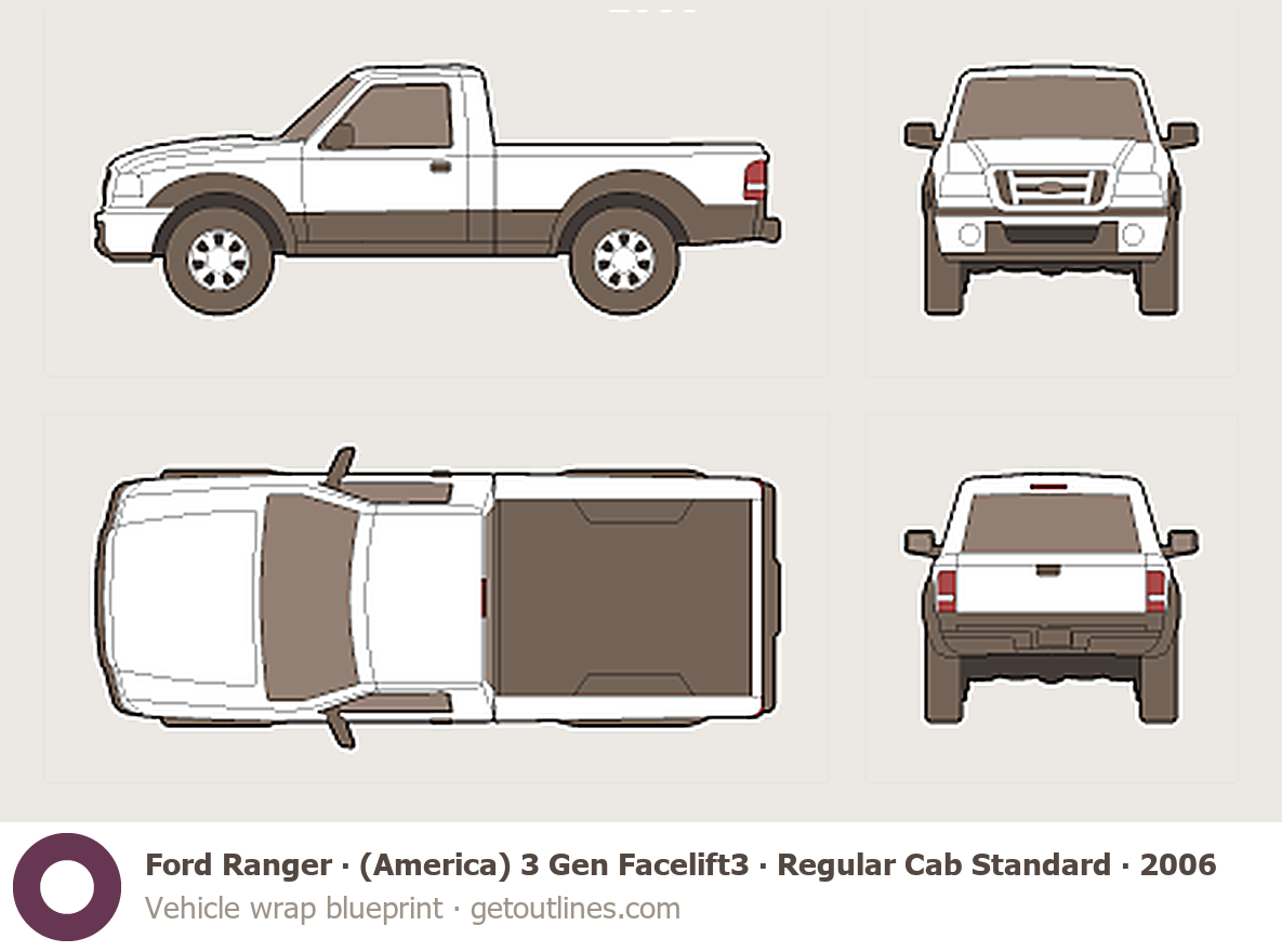 This 2006 Ford Ranger (America) 3 Gen Facelift3 Regular Cab Standard Bed Pickup Truck blueprint helps designers, wrap studios, and 3D artists simplify their workflow and save valuable time for creative work instead of routine tasks.