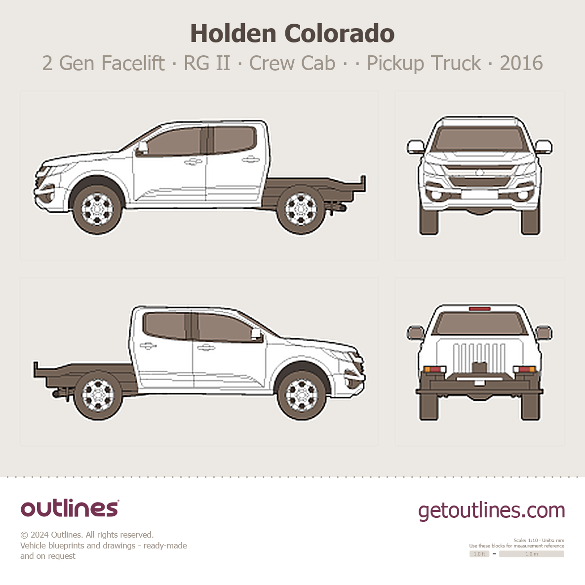 This is a blueprint of the Colorado, produced by carmaker Holden in 2016 - Present (2025, 2026). It features a Pickup Truck body design and is classified as a Commercial vehicle.