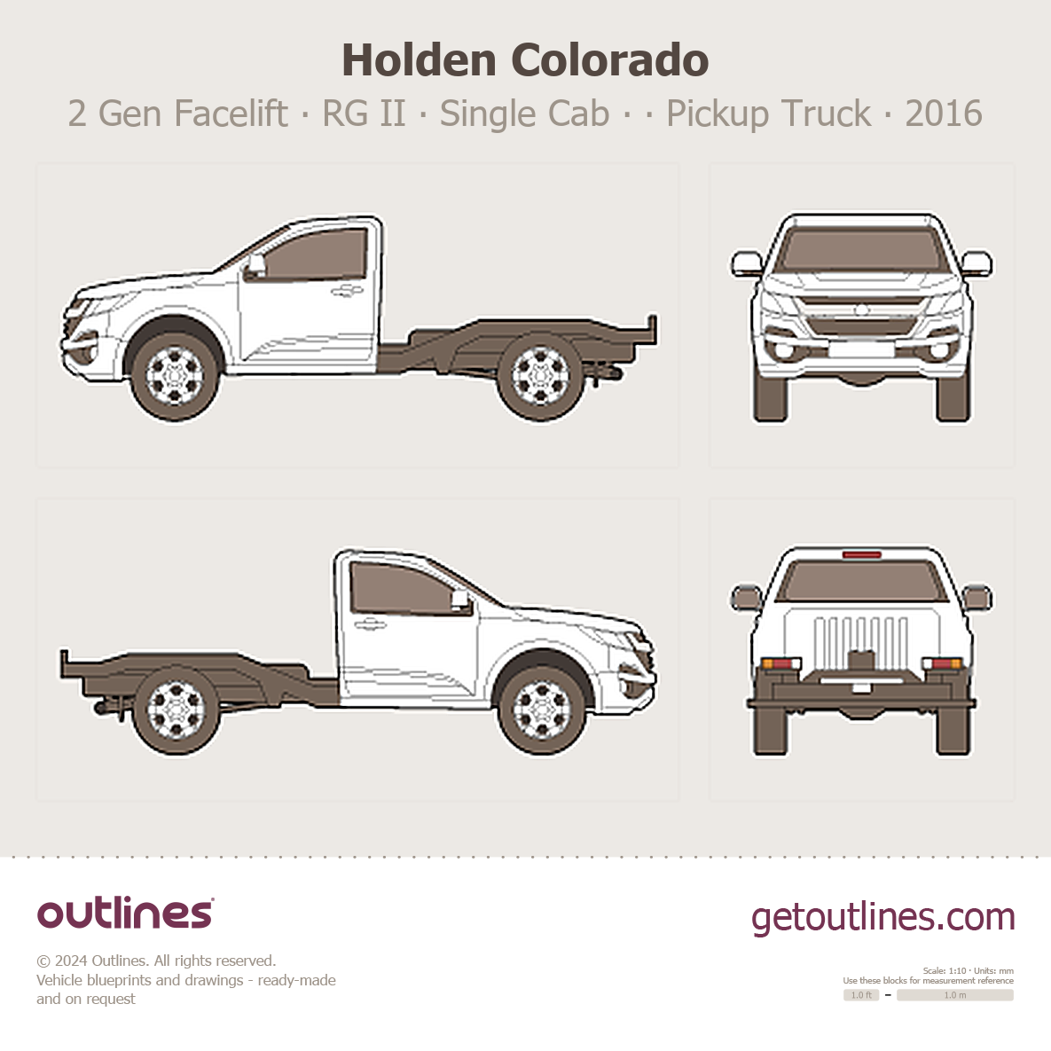 This is a blueprint of the Colorado, produced by carmaker Holden in 2016 - Present (2025, 2026). It features a Pickup Truck body design and is classified as a Commercial vehicle.