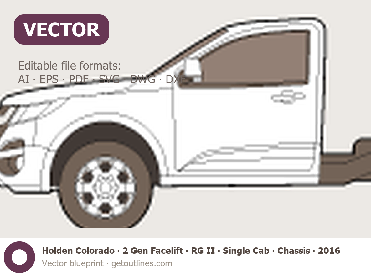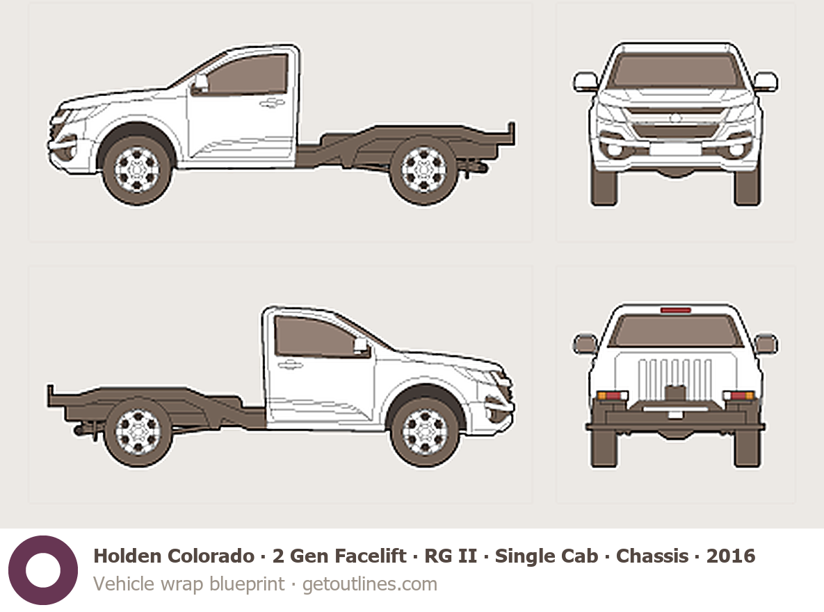 This 2016 Holden Colorado 2 Gen Facelift ∙ RG II Single Cab ∙ Chassis Pickup Truck blueprint helps designers, wrap studios, and 3D artists simplify their workflow and save valuable time for creative work instead of routine tasks.