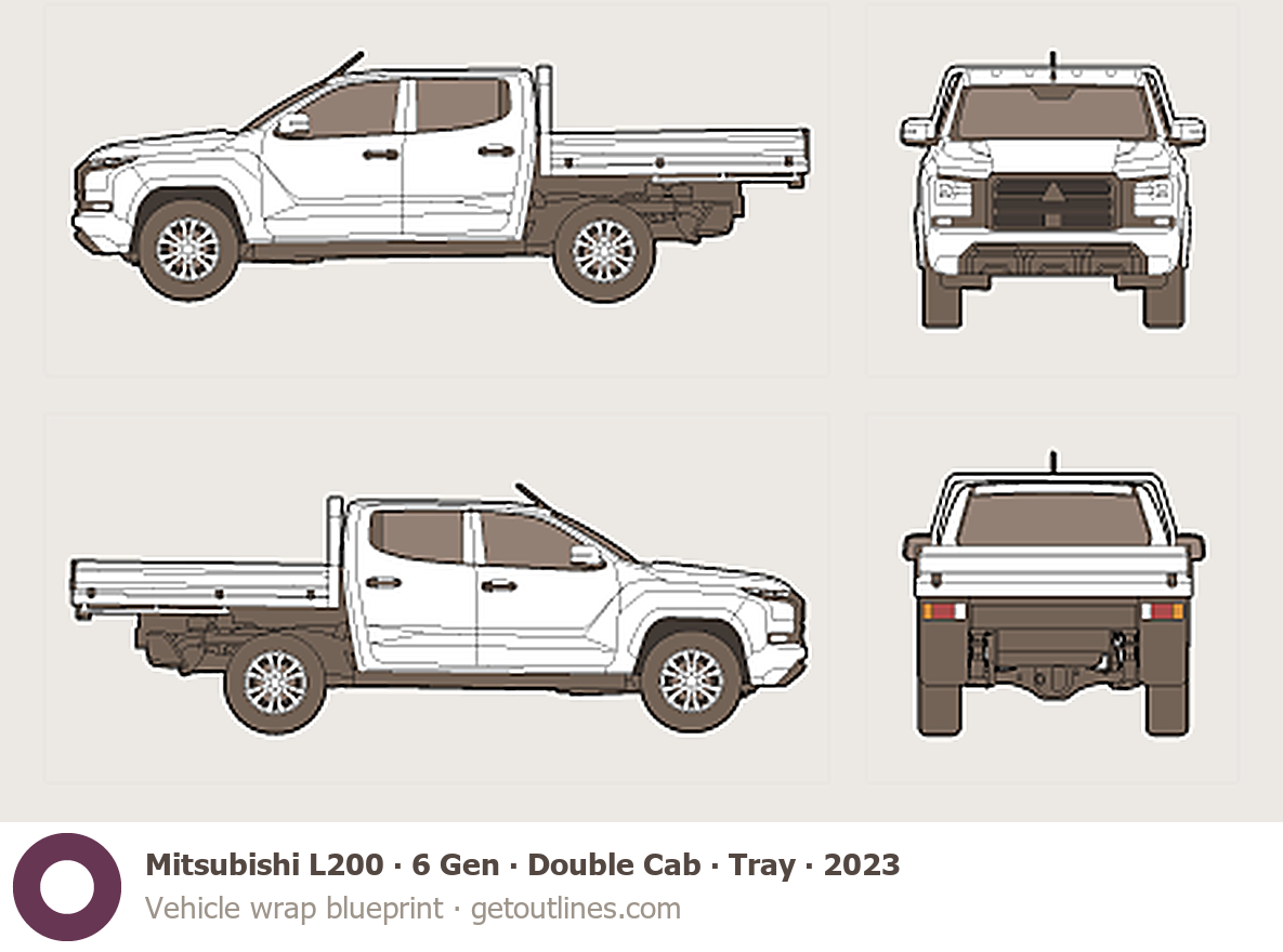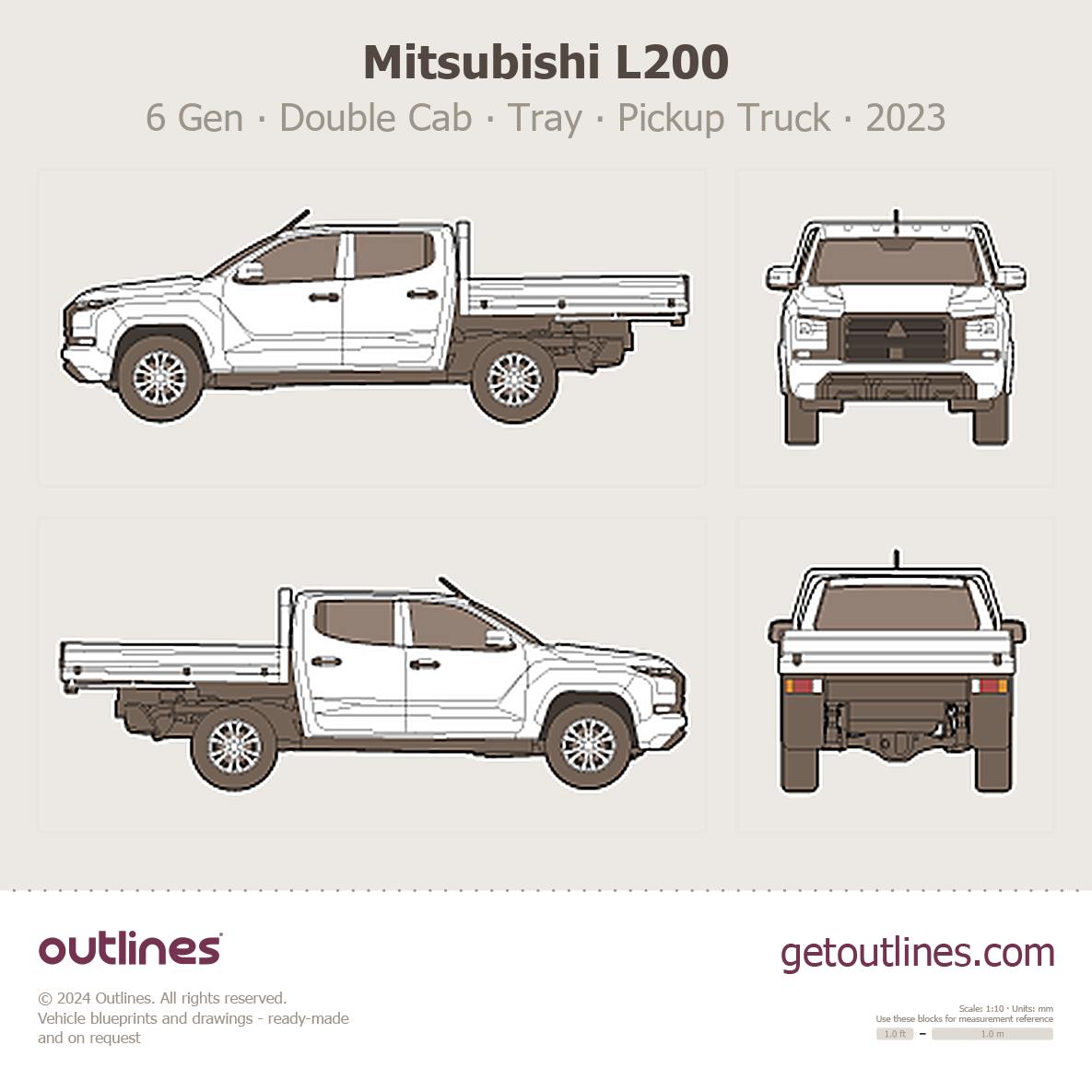 Buy this Mitsubishi L200 6 Gen blueprint and line drawing in high-quality editable vector file formats. Best for 3D and car wrap design.