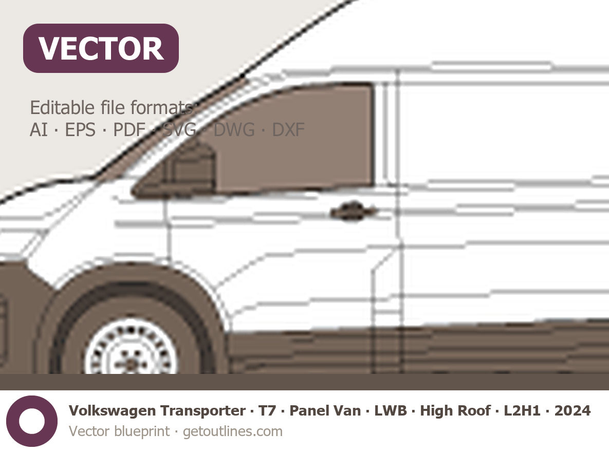 This 2024 Volkswagen Transporter T7 Panel Van ∙ LWB ∙ High Roof ∙ L2H1 Van blueprint helps designers, wrap studios, and 3D artists simplify their workflow and save valuable time for creative work instead of routine tasks.