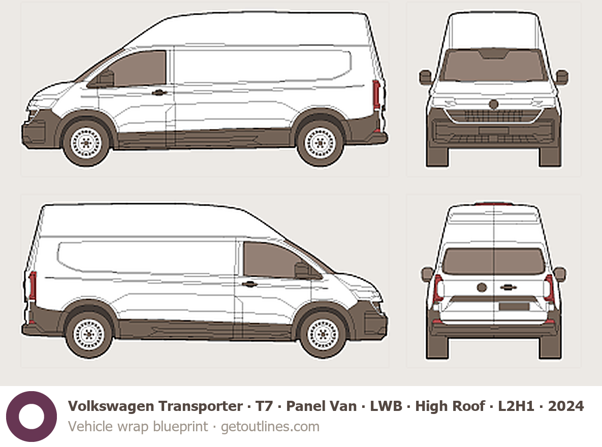 This template is suitable for Volkswagen Transporter models from 2024 to 2025, including 2024, and 2025 model years, and is commonly used for vehicle wrap and signage design.