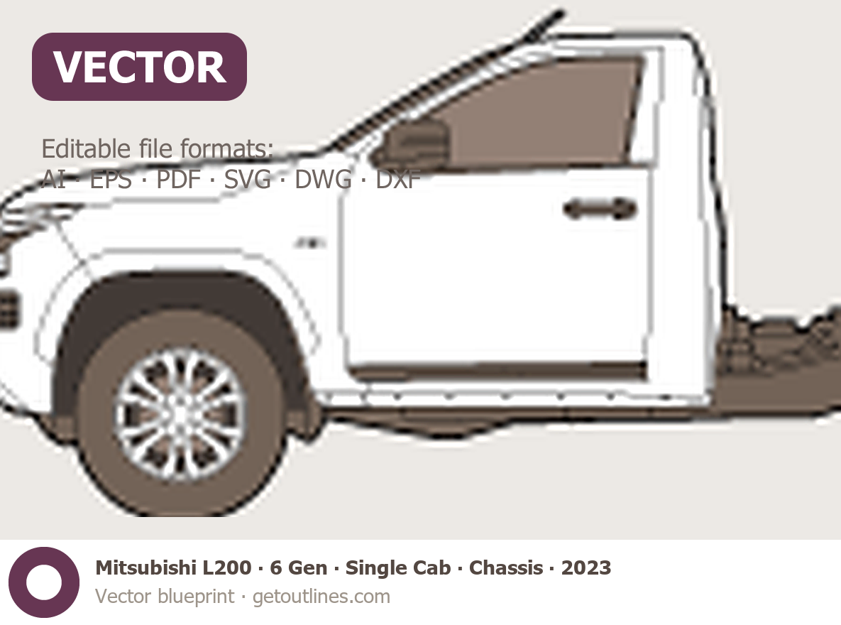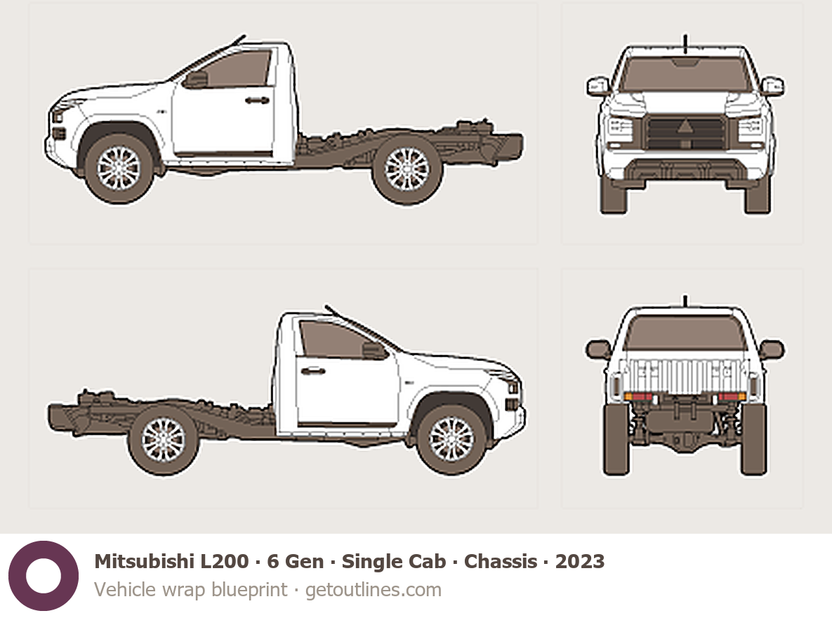 This 2023 Mitsubishi L200 6 Gen Single Cab ∙ Chassis Pickup Truck blueprint helps designers, wrap studios, and 3D artists simplify their workflow and save valuable time for creative work instead of routine tasks.