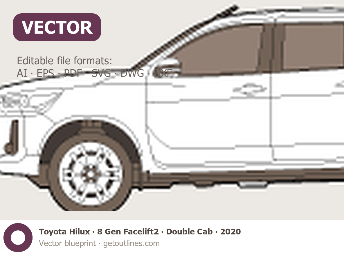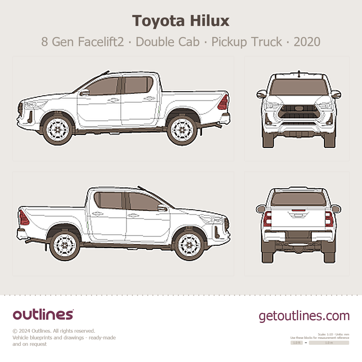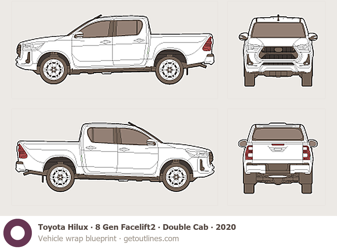 This 2020 Toyota Hilux 8 Gen Facelift2 Double Cab Pickup Truck blueprint helps designers, wrap studios, and 3D artists simplify their workflow and save valuable time for creative work instead of routine tasks.