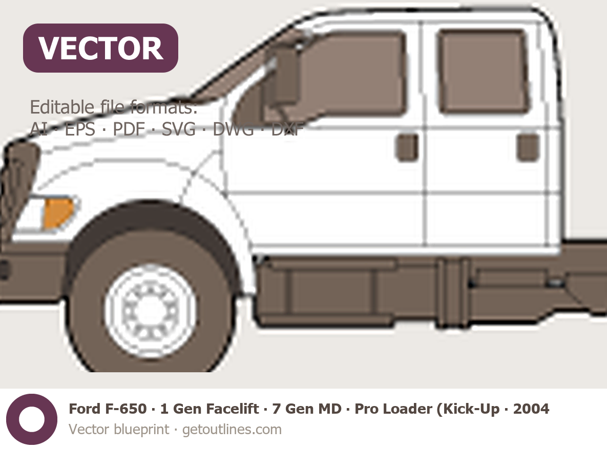 This 2004 Ford F-650 1 Gen Facelift ∙ 7 Gen MD Pro Loader (Kick-Up Frame) ∙ Crew Cab ∙ 170/60 ∙ XLT Heavy Truck blueprint helps designers, wrap studios, and 3D artists simplify their workflow and save valuable time for creative work instead of routine tasks.