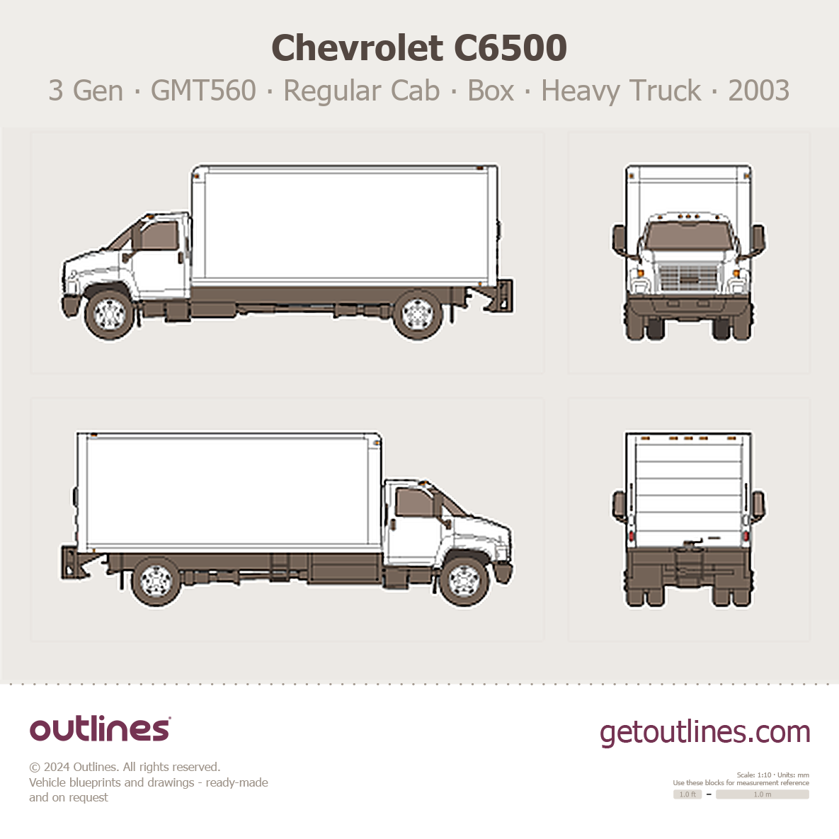 This 2003 Chevrolet C6500 3 Gen ∙ GMT560 Regular Cab ∙ Box Truck Heavy Truck blueprint helps designers, wrap studios, and 3D artists simplify their workflow and save valuable time for creative work instead of routine tasks.