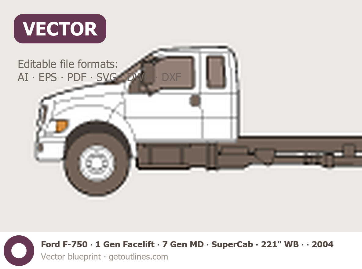 This 2004 Ford F-750 1 Gen Facelift ∙ 7 Gen MD SuperCab ∙ 221" WB ∙ 126" CA ∙ XLT Heavy Truck blueprint helps designers, wrap studios, and 3D artists simplify their workflow and save valuable time for creative work instead of routine tasks.
