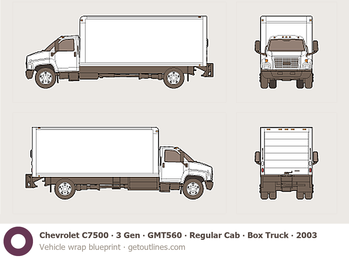 This 2003 Chevrolet C7500 3 Gen ∙ GMT560 Regular Cab ∙ Box Truck Heavy Truck blueprint helps designers, wrap studios, and 3D artists simplify their workflow and save valuable time for creative work instead of routine tasks.