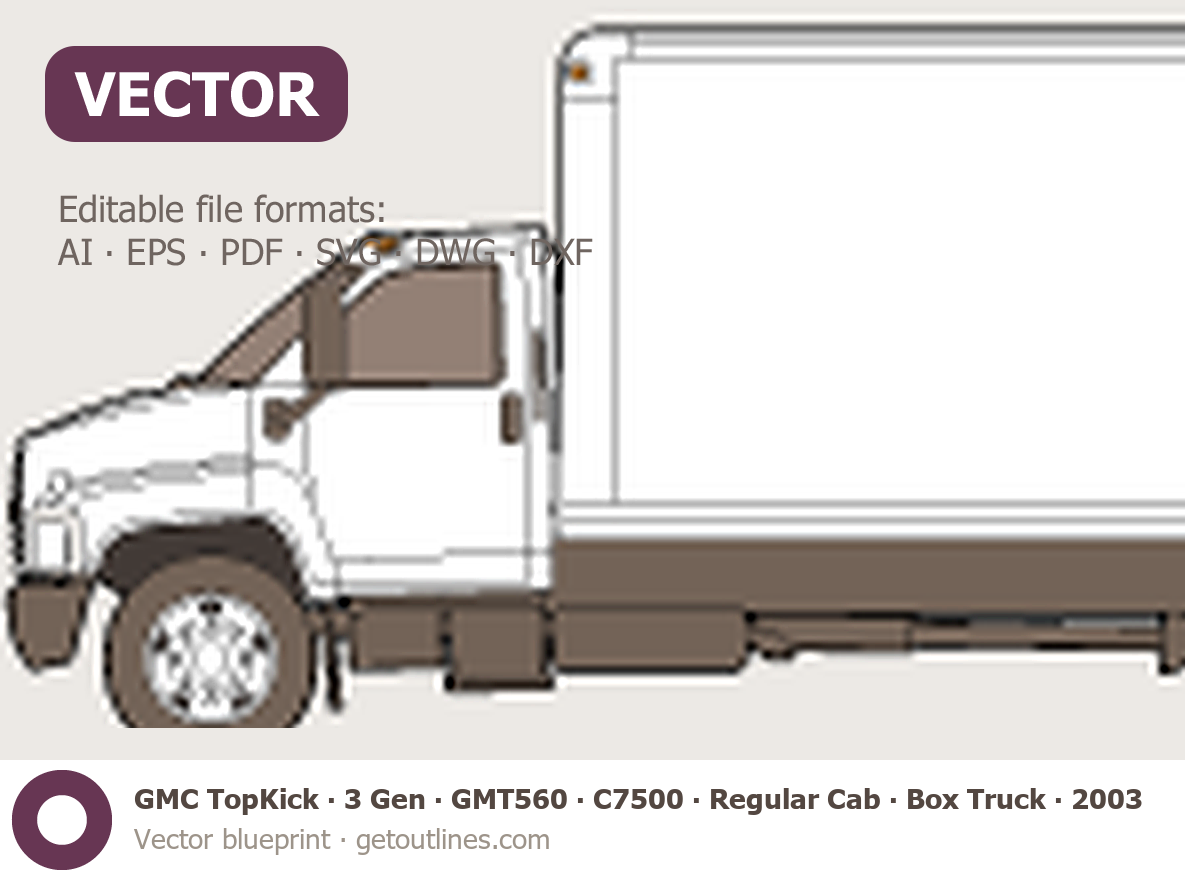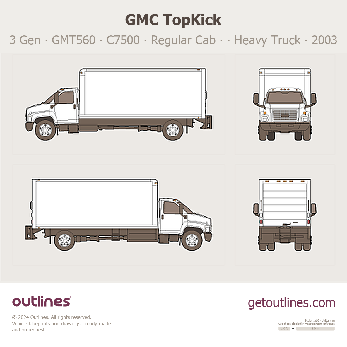 This 2003 GMC TopKick 3 Gen ∙ GMT560 C7500 ∙ Regular Cab ∙ Box Truck Heavy Truck blueprint helps designers, wrap studios, and 3D artists simplify their workflow and save valuable time for creative work instead of routine tasks.