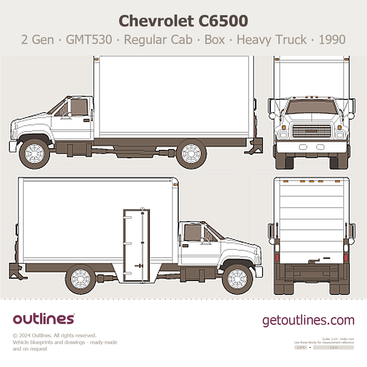This 1990 Chevrolet C6500 2 Gen ∙ GMT530 Regular Cab ∙ Box Truck Heavy Truck blueprint helps designers, wrap studios, and 3D artists simplify their workflow and save valuable time for creative work instead of routine tasks.
