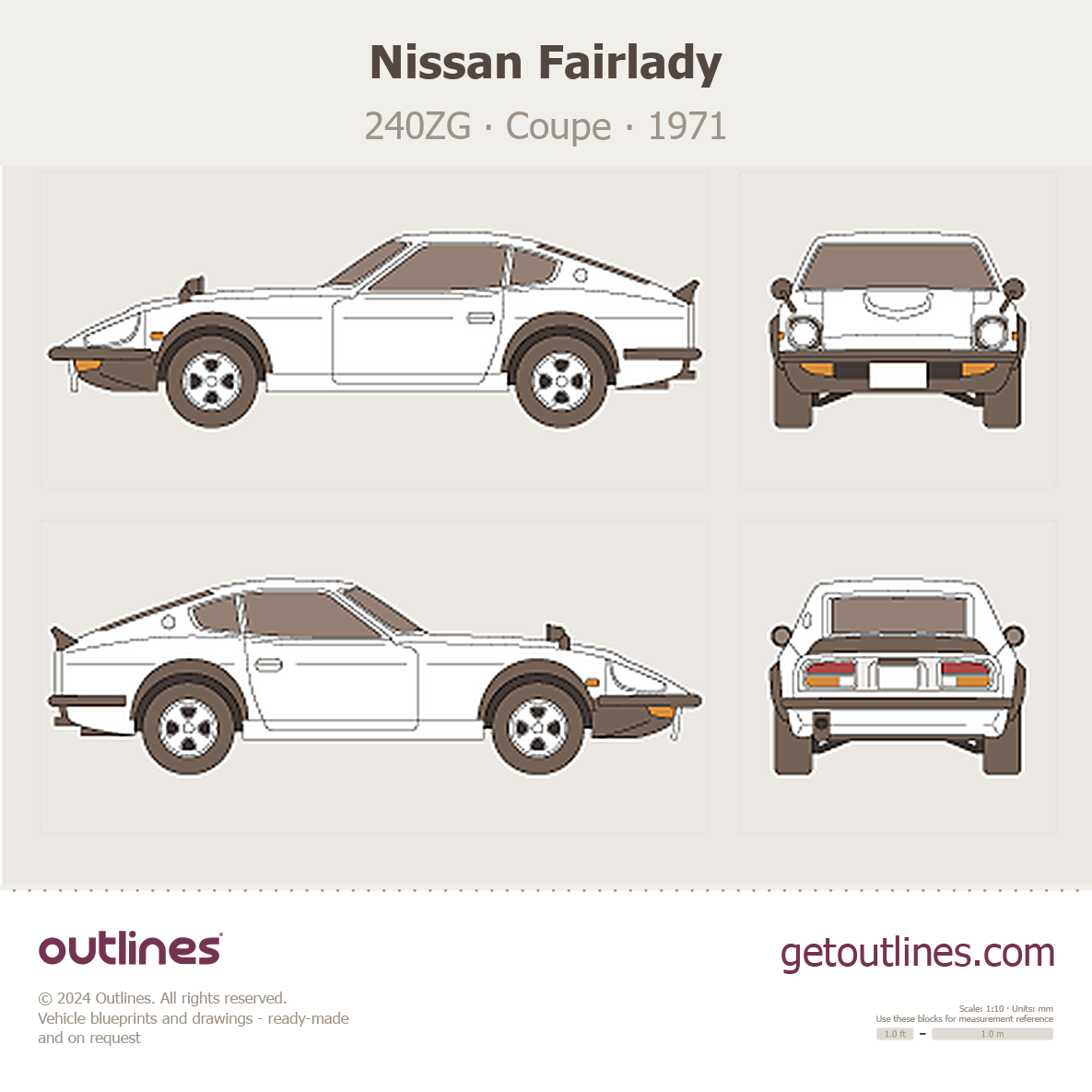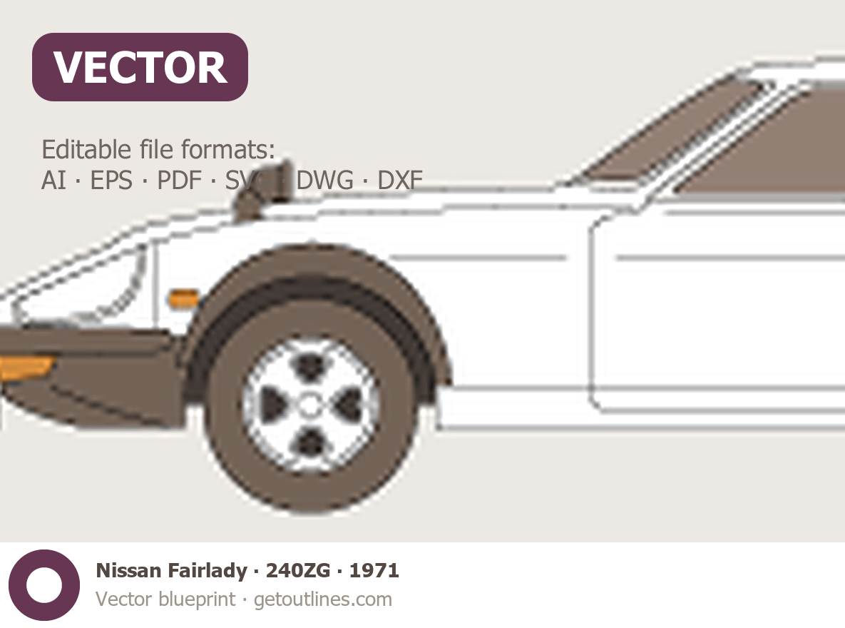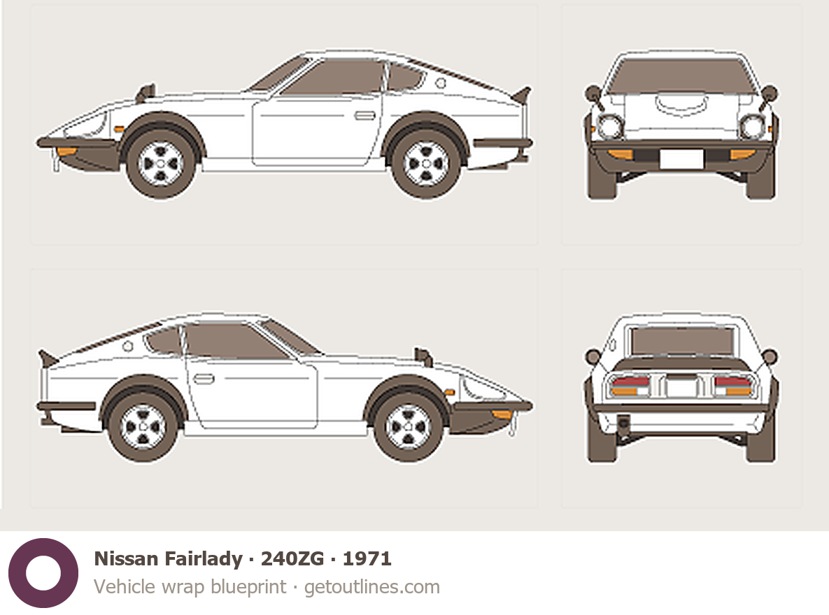 Buy this Nissan Fairlady 240ZG blueprint and line drawing in high-quality editable vector file formats. Best for 3D and car wrap design.