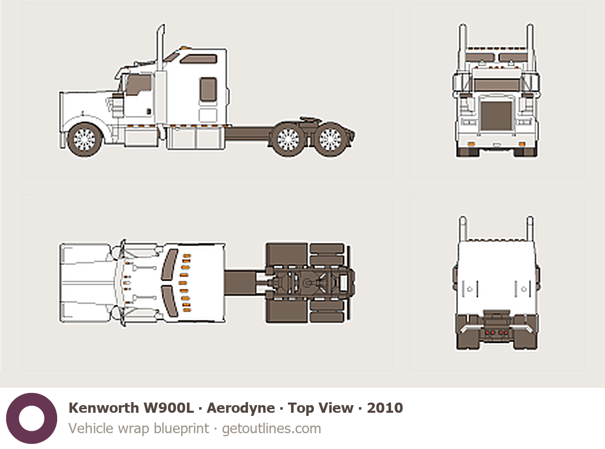 This 2010 Kenworth W900L Aerodyne ∙ Top View Heavy Truck blueprint helps designers, wrap studios, and 3D artists simplify their workflow and save valuable time for creative work instead of routine tasks.
