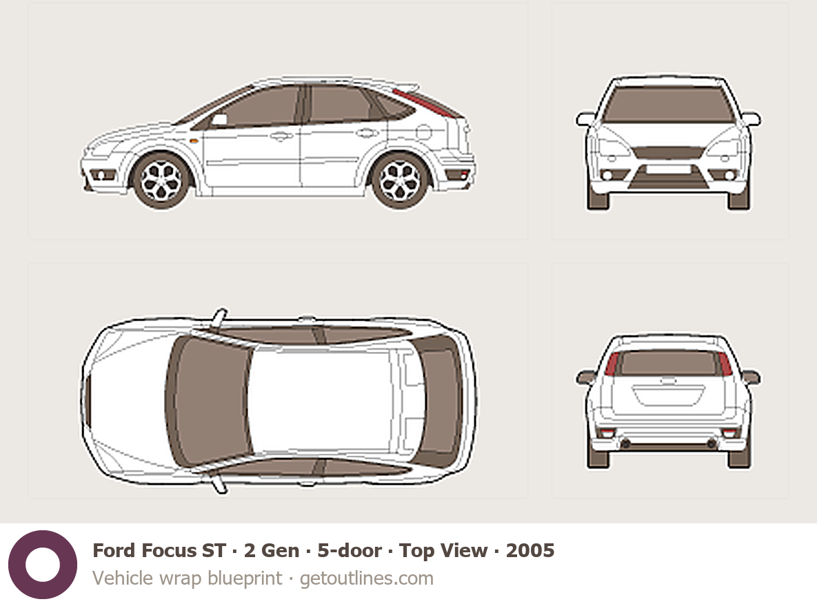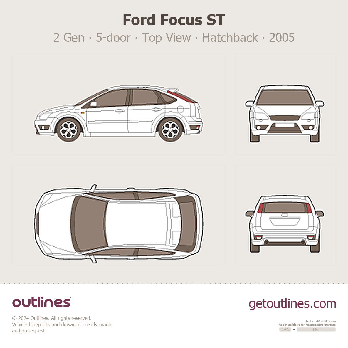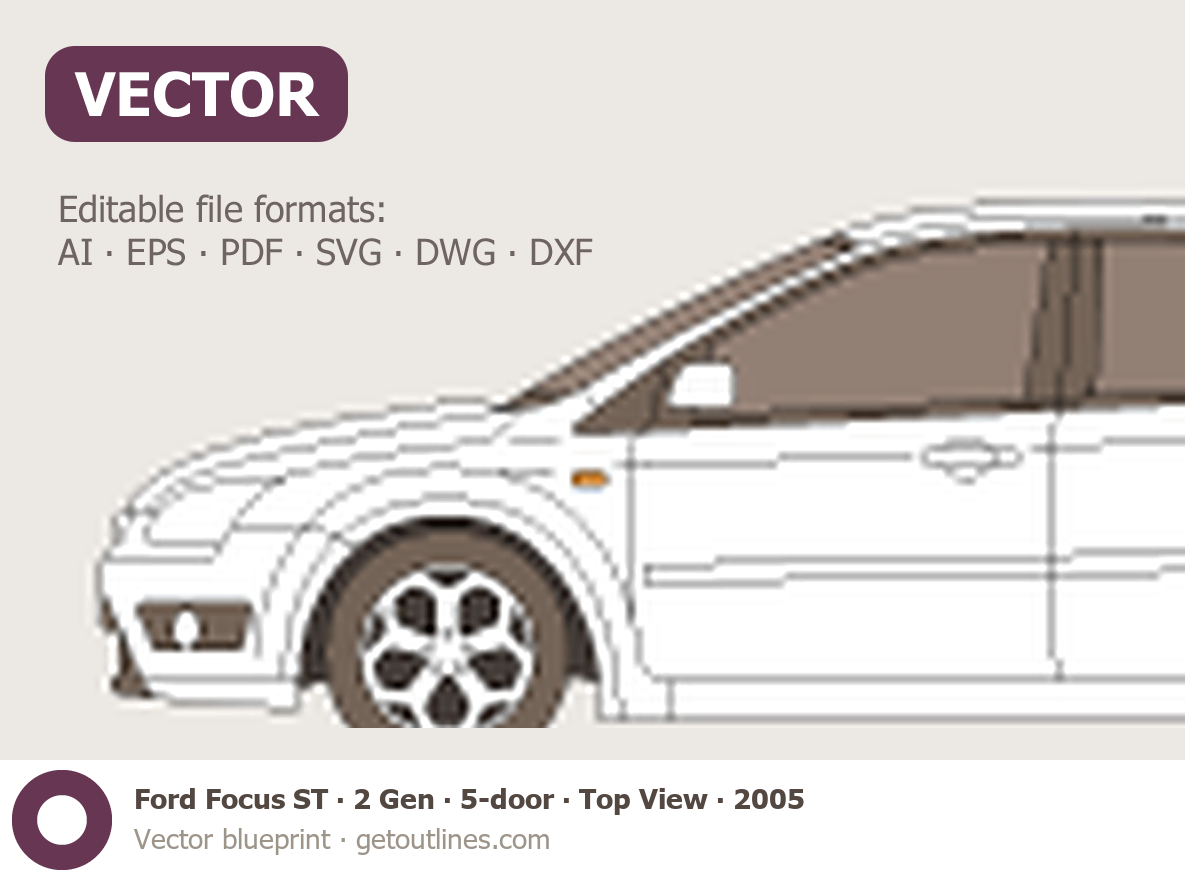 Buy this Ford Focus ST 2 Gen blueprint and line drawing in high-quality editable vector file formats. Best for 3D and car wrap design.