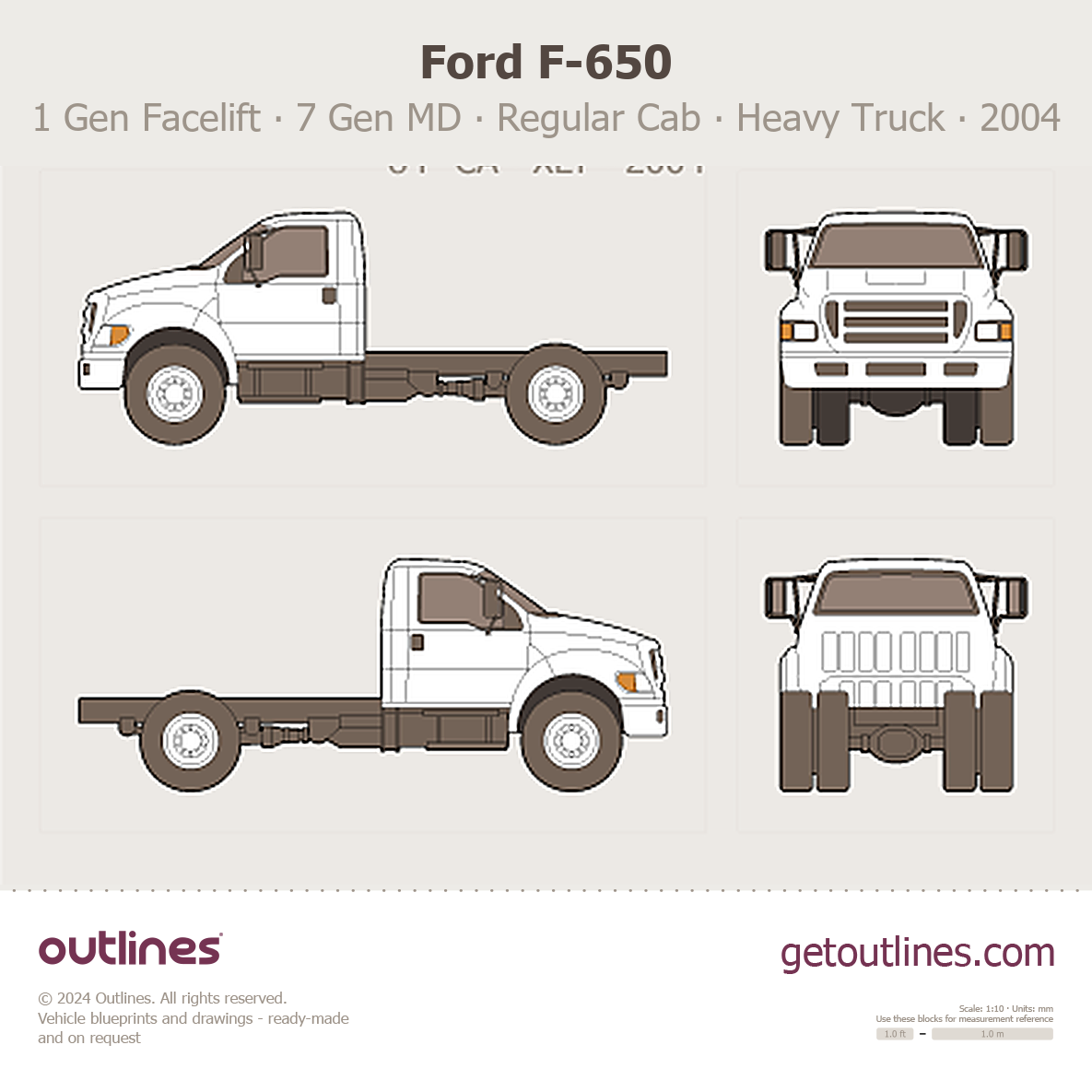 This 2004 Ford F-650 1 Gen Facelift ∙ 7 Gen MD Regular Cab ∙ 158" WB ∙ 84" CA ∙ XLT Heavy Truck blueprint helps designers, wrap studios, and 3D artists simplify their workflow and save valuable time for creative work instead of routine tasks.
