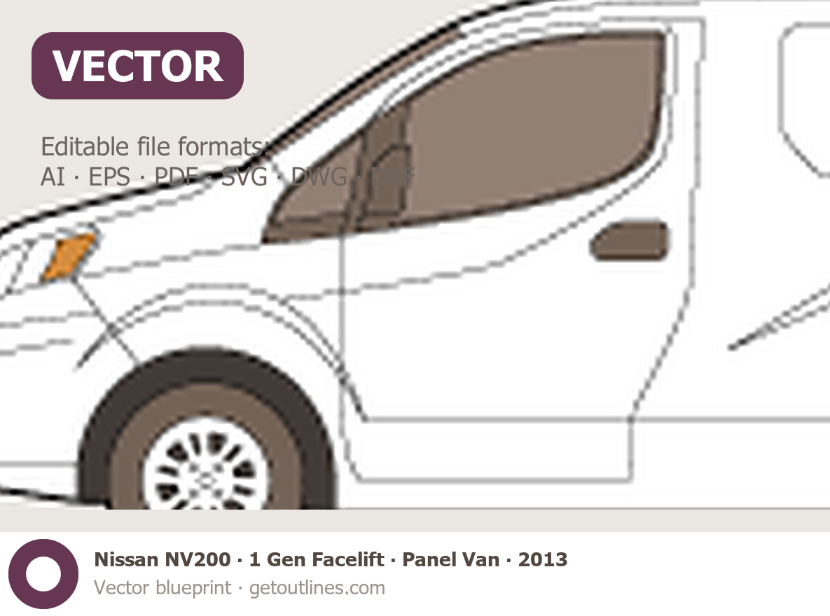 This 2013 Nissan NV200 1 Gen Facelift Panel Van Van blueprint helps designers, wrap studios, and 3D artists simplify their workflow and save valuable time for creative work instead of routine tasks.