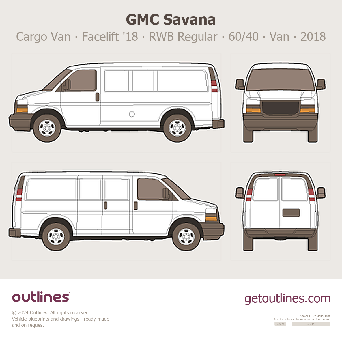 This is a blueprint of the Savana, produced by carmaker GMC in 2018 - 2025. It features a Van body design and is classified as a Commercial vehicle.