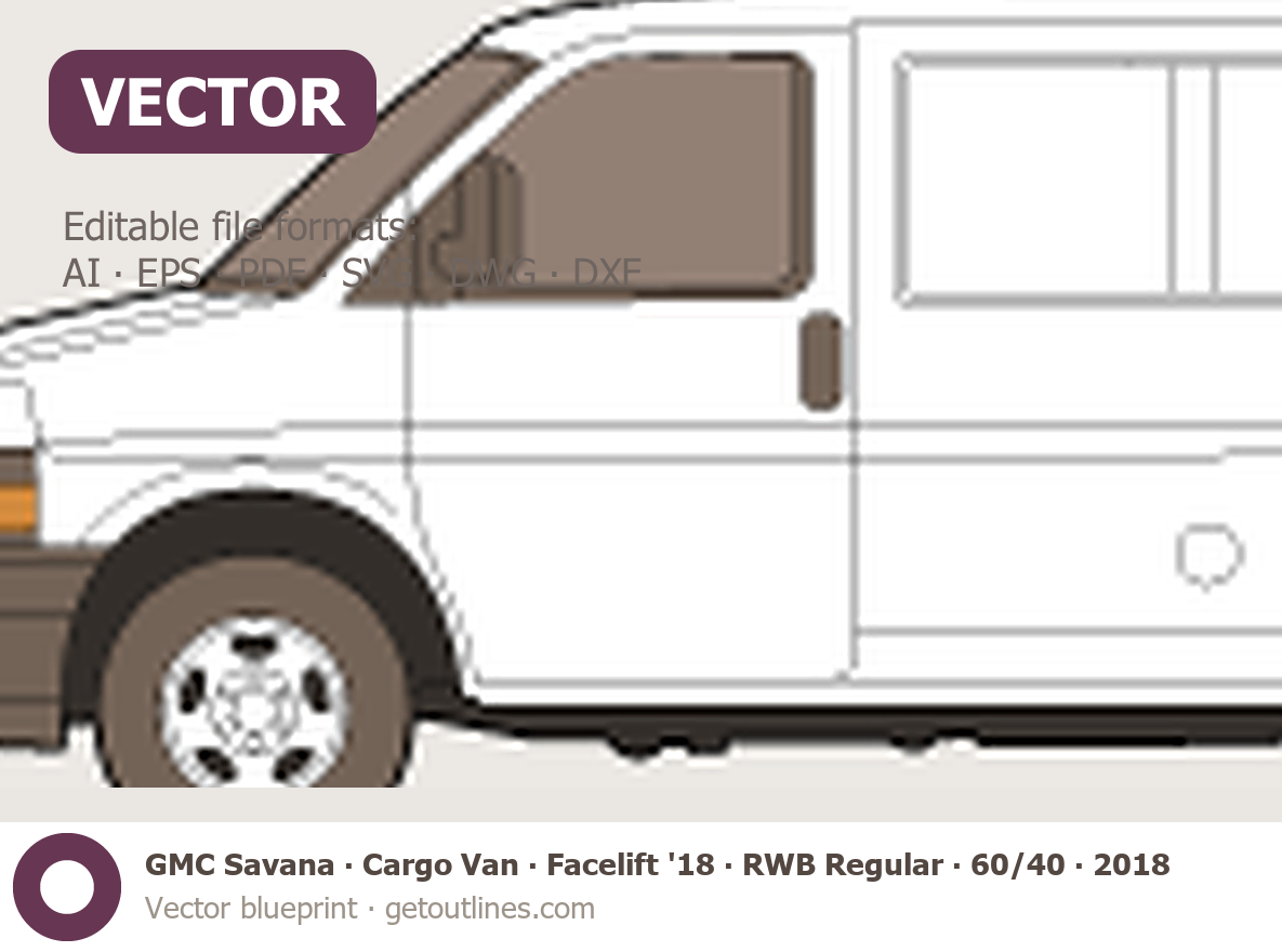 This 2018 GMC Savana Cargo Van ∙ Facelift '18 RWB Regular ∙ 60/40 Doors ∙ LS ∙ WT ∙ Work Van Van blueprint helps designers, wrap studios, and 3D artists simplify their workflow and save valuable time for creative work instead of routine tasks.