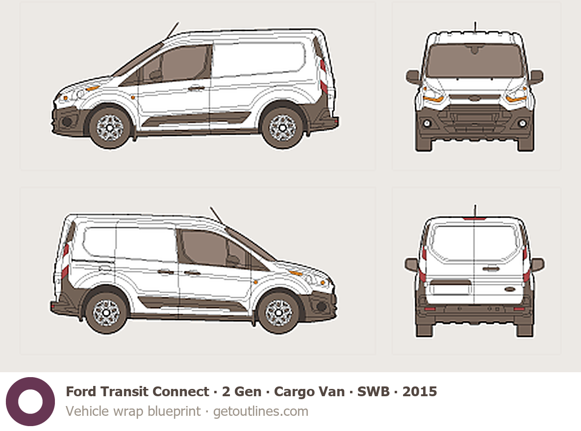 This 2015 Ford Transit Connect 2 Gen Cargo Van ∙ SWB Van blueprint helps designers, wrap studios, and 3D artists simplify their workflow and save valuable time for creative work instead of routine tasks.