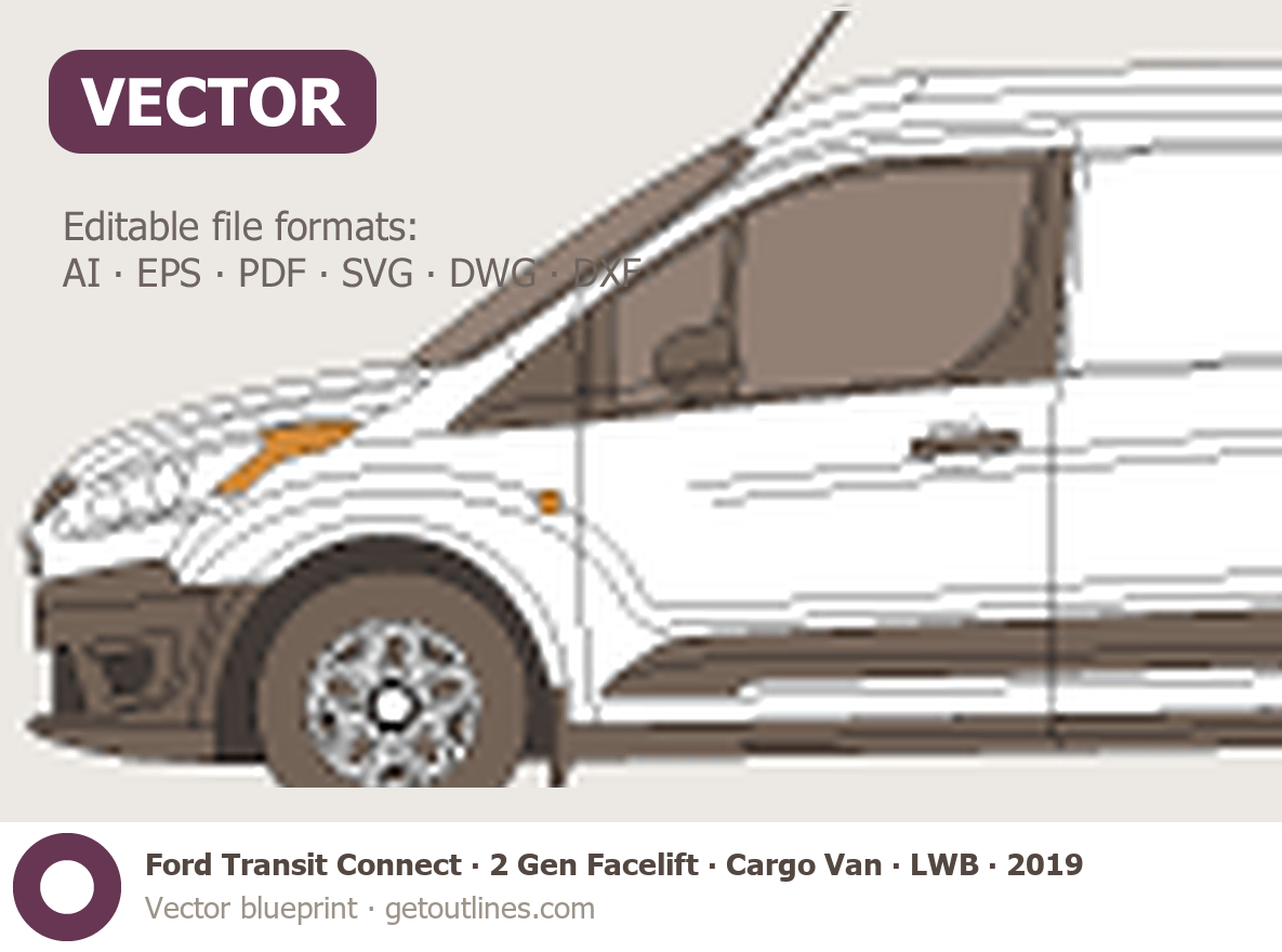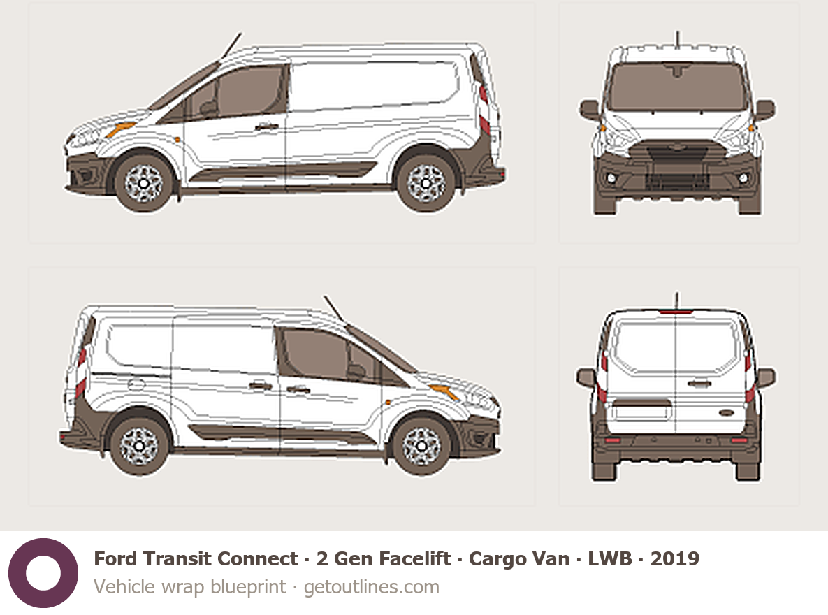 This 2019 Ford Transit Connect 2 Gen Facelift Cargo Van ∙ LWB Van blueprint helps designers, wrap studios, and 3D artists simplify their workflow and save valuable time for creative work instead of routine tasks.